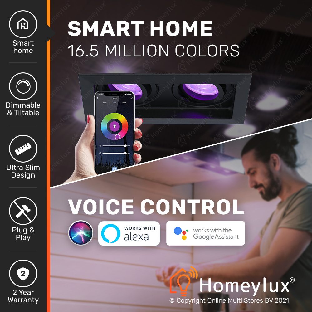 Deze dubbele LED inbouw spot wordt installeer klaar geleverd, dit betekent dat een spot bestaat uit het kantelbare armatuur inclusief de klemveren, twee vijf.vijf Watt smart RGBWW GU10 LED spots en twee GU10 fittingen.