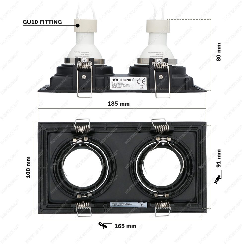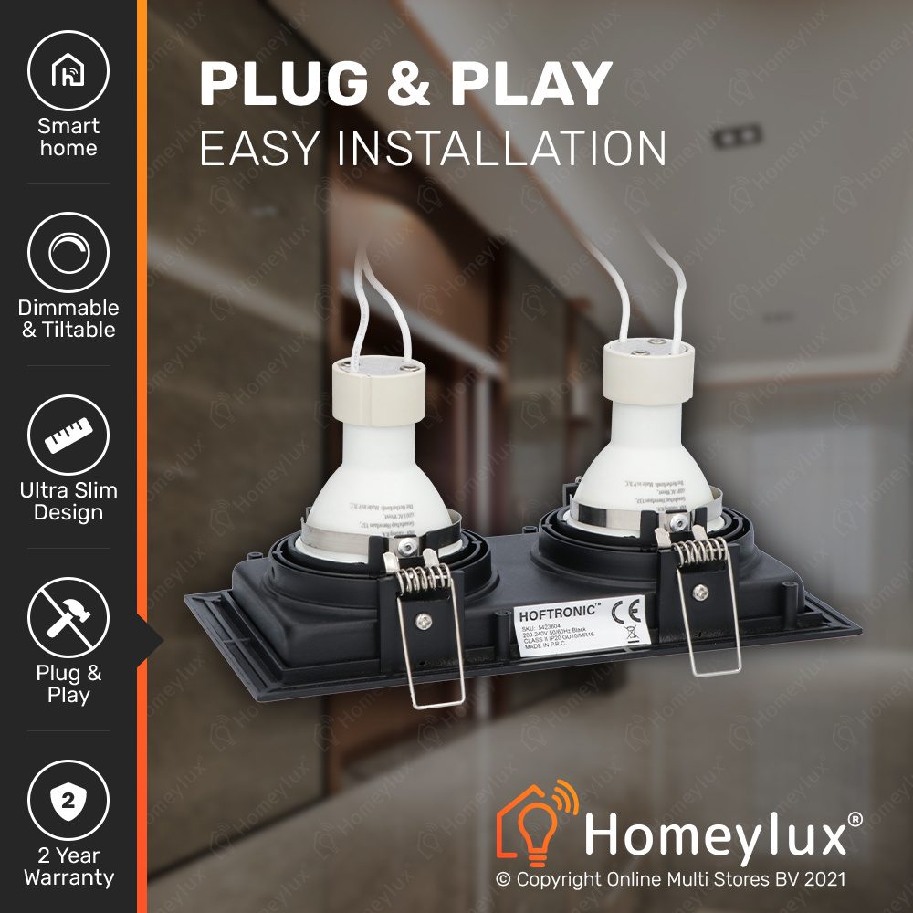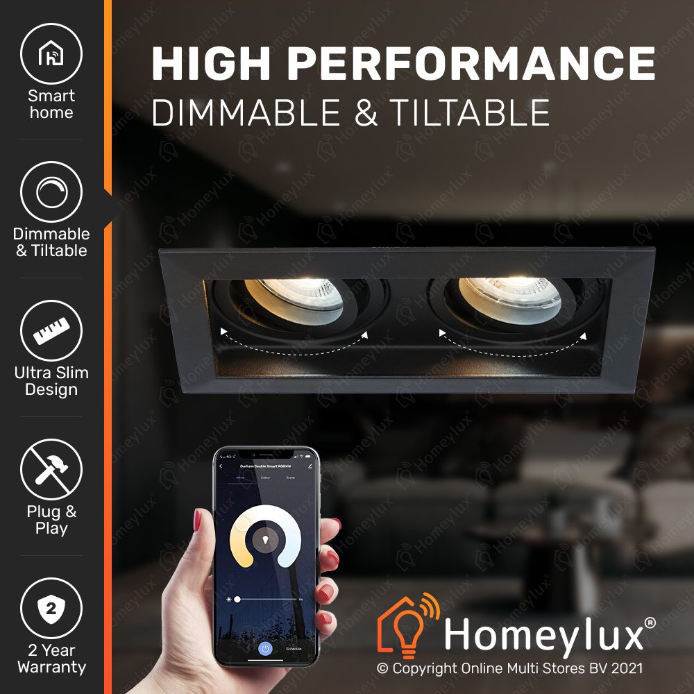 De Durham dubbele smart LED inbouwspot is kantelbaar waardoor de lichtbundel naar specifieke ruimtes gericht kan worden, tevens zit de GU10 LED spot iets verzonken in het armatuur waardoor je niet regelrecht in de lichtbron kijkt. Deze dubbele uitvoering zorgt ervoor dat je nog eenvoudige brede ruimtes kan uitlichten. Een profijt van deze LED spot is dat de GU10 spot welke in het armatuur zit substitueren kan worden. Het aanschaffen van een geheel nieuwe LED inbouwspot is dus niet nodig. Je kunt probleemloos de GU10 spot uit het armatuur halen en vervangen voor een andere GU10 spot. Het aansluiten van de LED spot is heel handig op het lichtnet van 230 Volt.