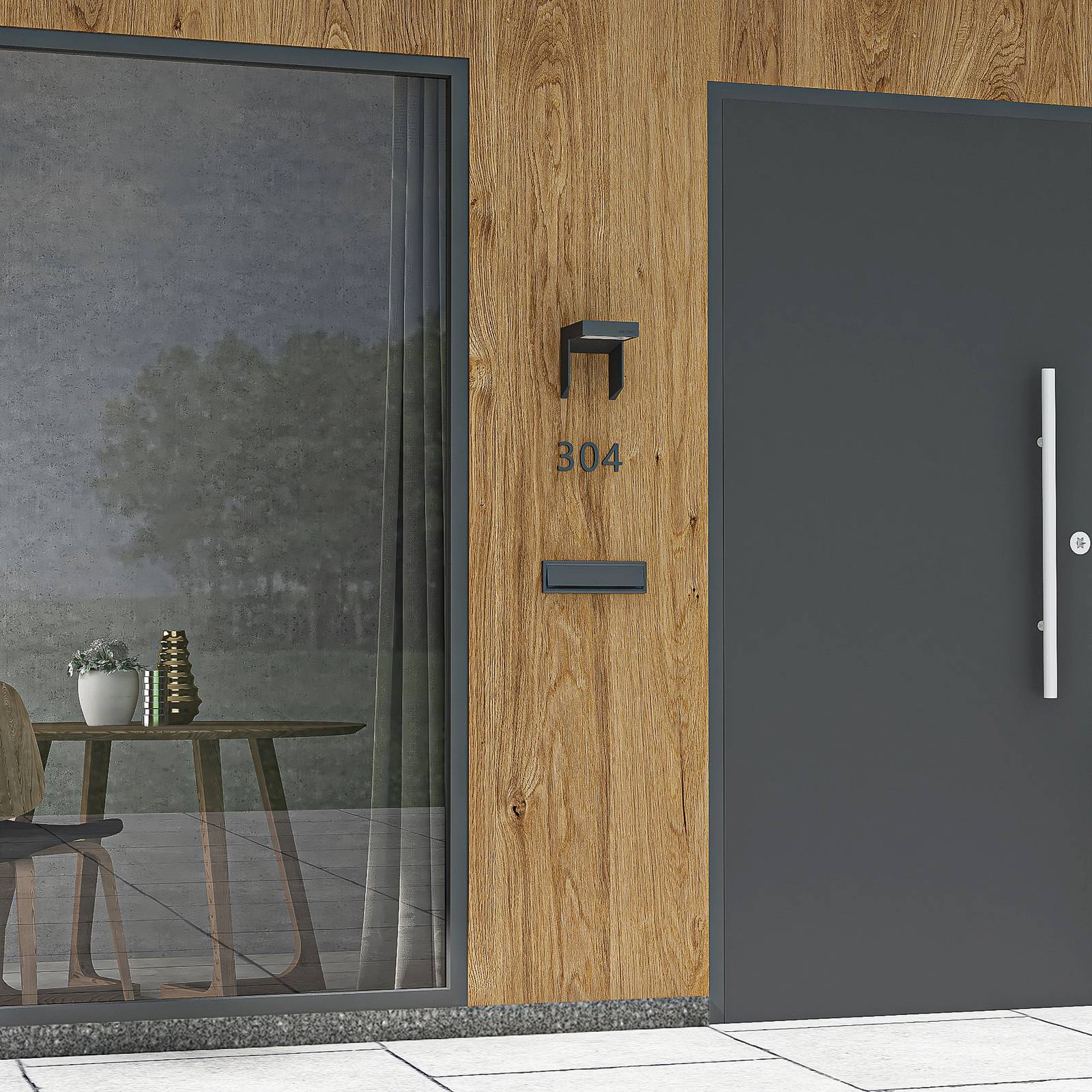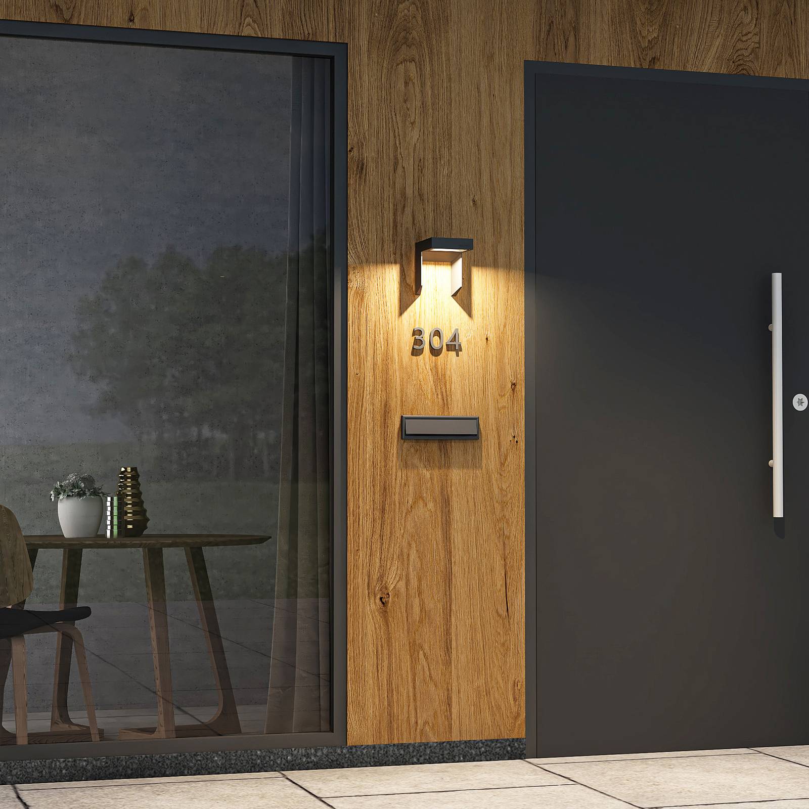 Grafietkleurige LED-buitenwandarmatuur Dynorma van gegoten aluminium in een exclusief design Dynorma is een moderne en hoekige LED-buitenwandlamp van gegoten aluminium, uitgevoerd in donker grafiet en voorzien van energiezuinige LED-technologie. Het ontwerp wordt gekenmerkt door exclusiviteit en ziet er bijzonder stijlvol uit. De warmwitte LED’s stralen door een glazen diffuser onder een brede hoek naar beneden en verlichten een groot gebied onder de armatuur. De wandarmatuur voor buiten is perfect voor het verlichten van entrees.