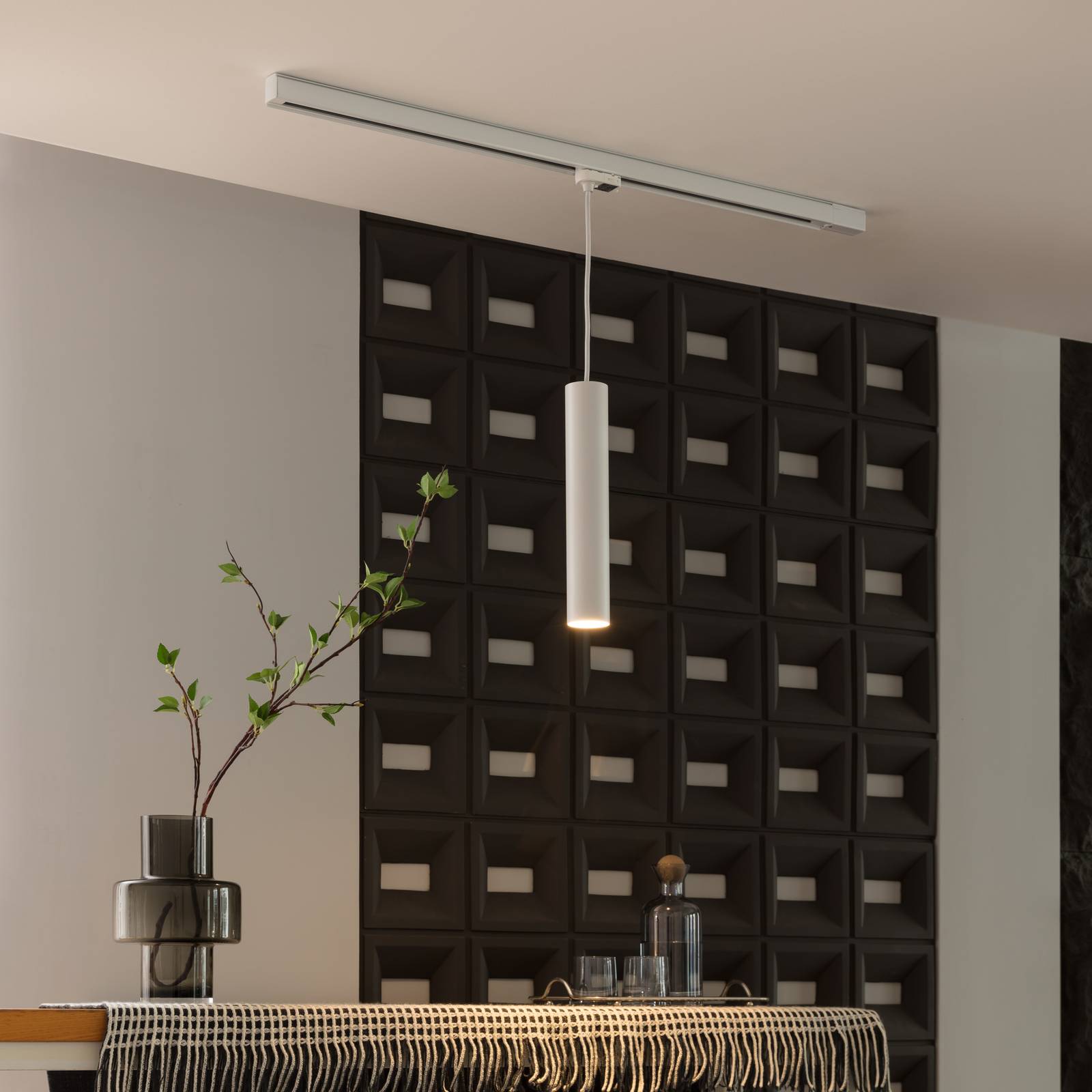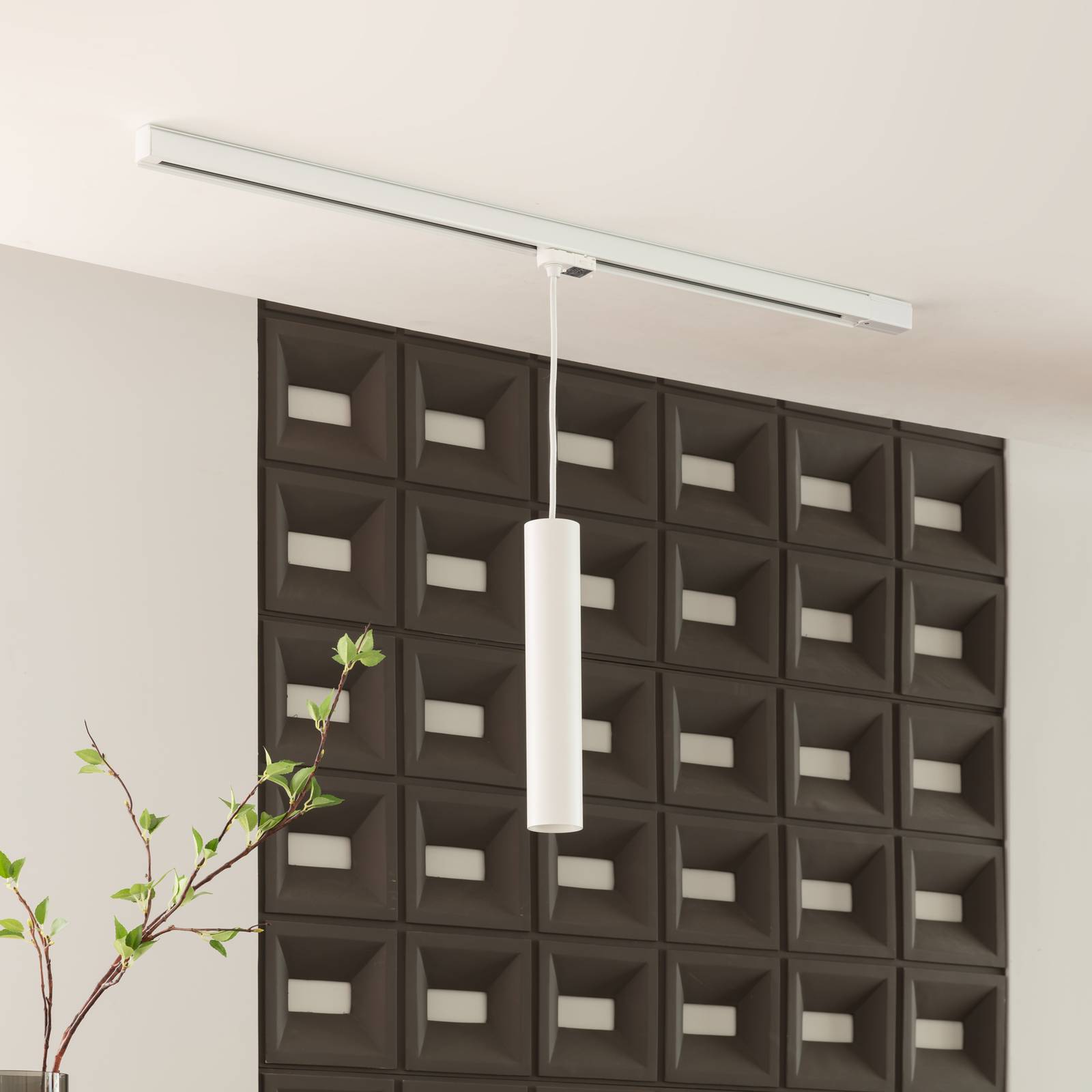 Witte Ejona hanglamp voor 3-fasen railsysteem, ronde cilindervorm Die Ejona hanglamp is ontworpen voor gebruik met een 3-fasen railsysteem en heeft een GU10 fitting die individueel kan worden voorzien van een geschikte lamp. Hier zijn bijvoorbeeld verschillende lichtkleuren en stralingshoeken beschikbaar, zodat er vrijwel geen grenzen zijn aan het gebruik in privé woonruimten of commerciële ruimten en je de juiste verlichting kunt creëren. Het witte oppervlak van de ronde metalen kap in een smalle Form staat voor een harmonieuze en tijdloze expressie en past in vele omgevingen.