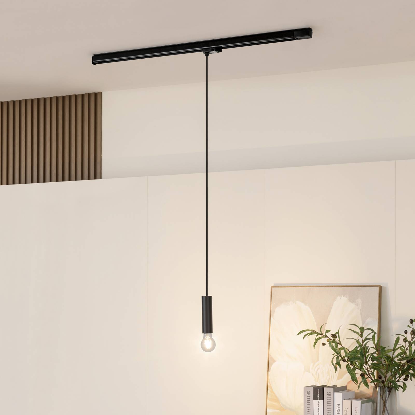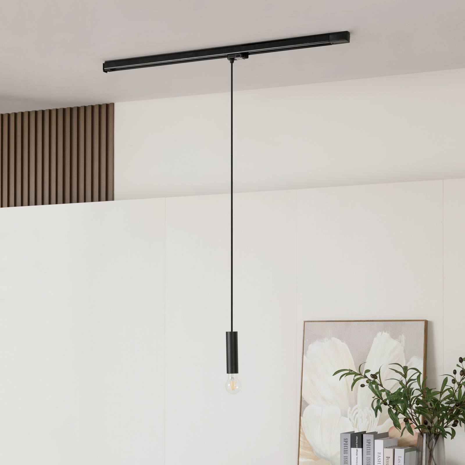 Cilindrische hanglamp Ejona voor gebruik met railsystem Ejona maakt indruk met haar eenvoudige maar effectieve uiterlijk. De kap van deze hanglamp is rond en smal en lijkt op een cilinder. Het oppervlak heeft een zwarte afwerking die koel en elegant oogt. De hanglamp integreert goed in privéomgevingen, maar past ook in commerciële ruimtes en is uitgerust met een 3-fasen railsysteem zodat ze samen met andere lampen kan worden gebruikt voor een verlichtingsoplossing op maat.