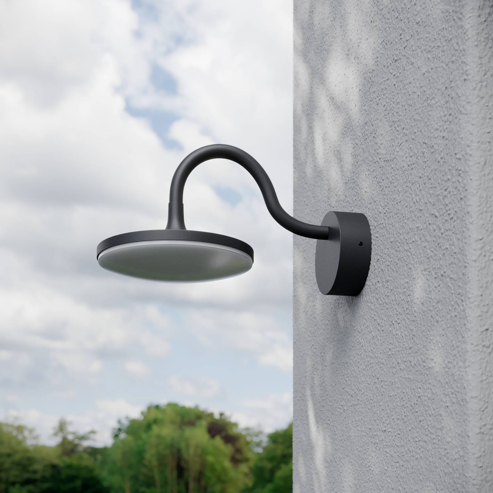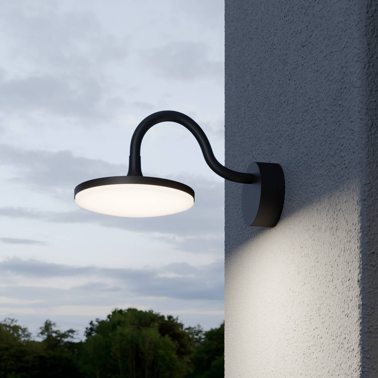 LED-buitenwandlamp Fineria in een prachtige vorm Een mooi design en een brede lichtverdeling en energie-efficiënte verlichting – dat zijn de kenmerken die de Fineria buitenmuurarmatuur doen opvallen. Gemaakt van aluminium met een gebogen beugel, heeft het armatuur een brede, vlakke kap met een gebogen polycarbonaat diffuser aan de onderzijde. Door de vlakke vormgeving van de metalen kap kan het licht over een groot oppervlak onder een grote hoek worden uitgestraald, zodat bijvoorbeeld een ingangsruimte over een groot oppervlak kan worden verlicht.