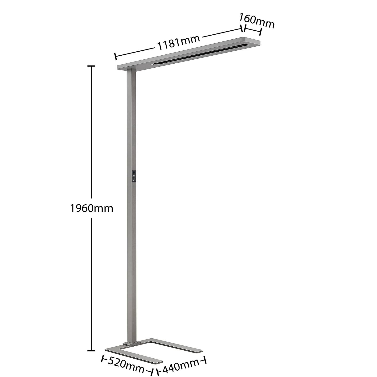 Direct stralende LED kantoorvloerlamp Ionel met zilveren oppervlak, dimmer, bewegingsmelder en daglichtsensor Ionel is een echt praktische LED-vloerlamp voor kantoorwerkplekken die haar licht naar beneden en naar boven uitstraalt, maar het grootste deel van het licht ontsnapt indirect naar boven. Hierdoor ontstaat voor de aanwezigen een zeer aangenaam rondomlicht op de werkplek, waardoor geconcentreerd werken mogelijk wordt. De ingebouwde LED’s van de vloerlamp schijnen in een universeel witte lichtkleur en kunnen desgewenst via een touchpad worden gedimd. Bovendien is de armatuur uitgerust met een bewegingsmelder en een daglichtsensor, zodat de Ionel vloerlamp haar licht deels zelf aan de eisen ter plaatse aanpast. Het licht flikkert niet en verblindt niet. Met een UGR-waarde van minder dan 12 is de staande armatuur ideaal voor gebruik op beeldschermwerkplekken. De armatuur is ontworpen voor dubbele werkplekken en de brede, U-vormige voet omvat ook de dubbele tafelpoten. De kabel kan zowel aan de voorkant als aan de achterkant aan de voet van de armatuur worden bevestigd, zodat de voet volledig op de tafelpoten of aan de muur kan worden geschoven. Technische gegevens: – flikkervrij licht – universele witte kleurtemperatuur (4.000 K) – direct en indirect licht – Stralingshoek: 145° boven, 80° onder – incl. bewegingsmelder – geïntegreerde daglichtsensor – UGR < 12 - slagvastheidsgraad IK06 - SDCM < 3 - U-vormige basis - ontworpen voor gebruik op dubbele werkstations Bekijk productspecificaties
