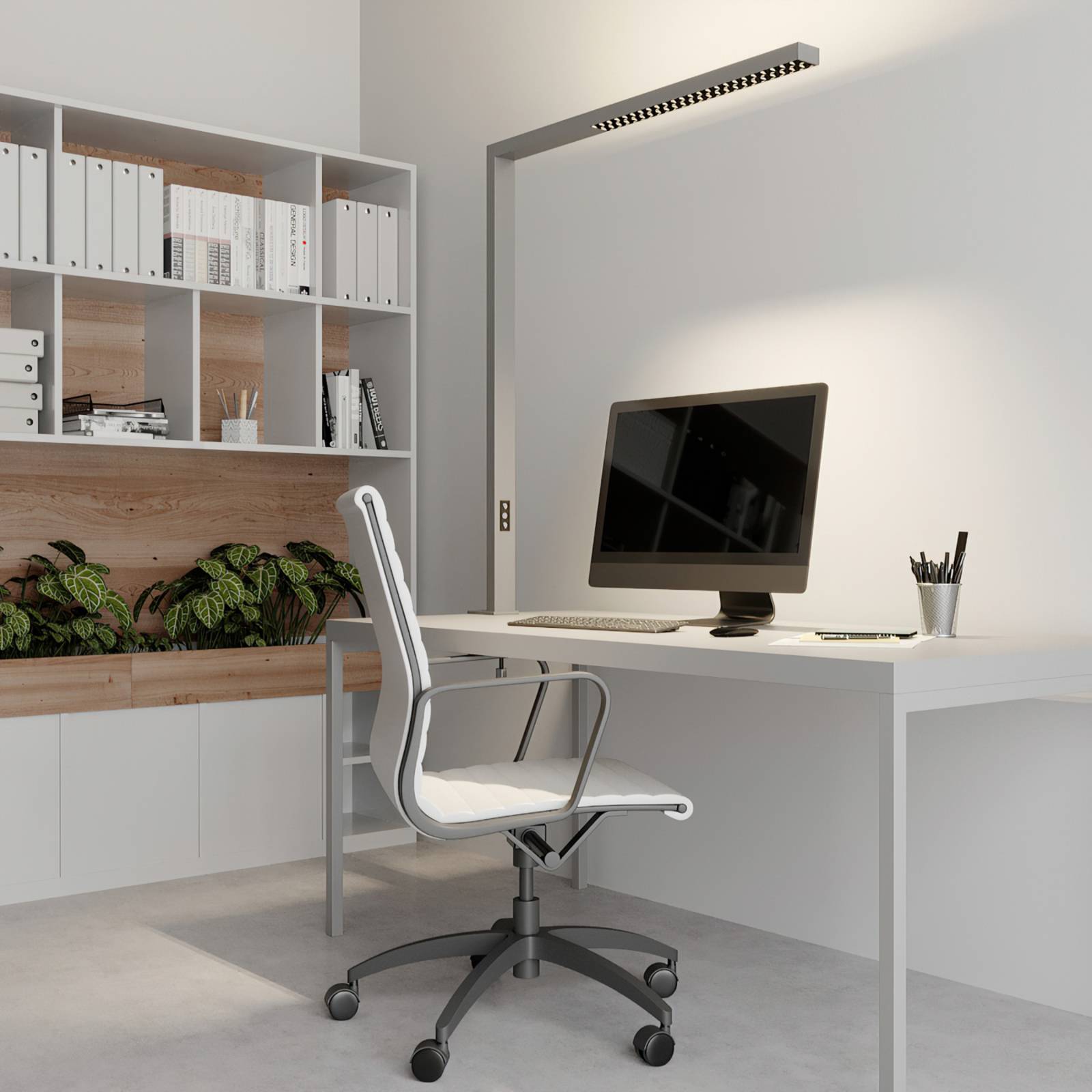 Zilveren LED kantoorklemarmatuur Jolinda met touchdimmer en direct-indirect lichtMet zijn klemvoet voor montage op een bureau in een kantoor of commerciële omgeving is de LED tafellamp Jolinda in zekere zin een innovatie in kantoorverlichting. De universele witte LED’s – een zeer goede lichtkleur voor kantooractiviteiten – stralen hun licht zowel naar boven als naar beneden uit, waarbij het grootste deel van het licht indirect naar boven in de ruimte doordringt, waardoor een zeer natuurlijk lichtbeeld ontstaat dat goed en geconcentreerd werken mogelijk maakt. Het directe lichtaandeel wordt bovendien gekenmerkt door het feit dat het vrijwel verblindingsvrij is en dat men niet bang hoeft te zijn voor hinderlijke lichteffecten tijdens het werk. Bovendien is het licht flikkervrij en biedt het de beste lichtkwaliteit voor geconcentreerd werken. Technische gegevens: – dimbaar via touchpad op het armatuurframe- flikkervrij licht- universele witte lichtkleur voor geconcentreerd werken- geïntegreerde klemvoet met schroefklem voor bevestiging aan de werkplek op kantoor (voor tafeldiktes van 1,5 cm tot 7 cm)- verblindingsvrij licht (UGR