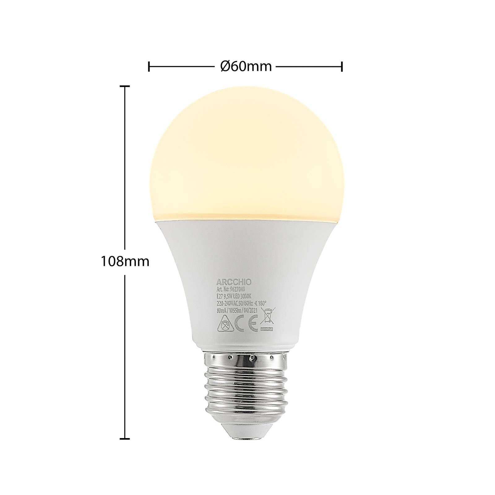 LED-lamp E27 A60 9,5W van kunststof, opaal met warmwitte lichtkleur (3.000 K) in een set van 3De helderheid van deze LED-lamp komt overeen met die van een conventionele gloeilamp met een stroomverbruik van 75 W, daarom is deze verlichtingsbron een energiebesparend alternatief voor gebruik in de meest uiteenlopende ruimtes. – niet dimbaar – de LED-lamp wordt geleverd in een praktische set van 3