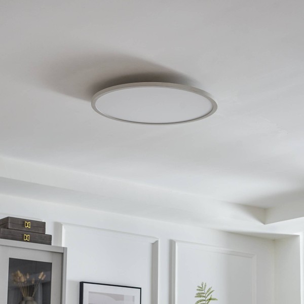 Dimbaar, met CCT-afstandsbediening en in een eenvoudig design: het LED paneel Brenda Deze plafondlamp maakt indruk met zijn subtiele witte charme en is voorzien van praktische extra’s. Het LED paneel Brenda heeft een rond metalen frame en ligt plat op het plafond. De lamp wordt geleverd met een CCT afstandsbediening en kan daarmee makkelijk van lichtkleur veranderen. Met de afstandsbediening kunt u echter niet alleen variëren van warmwit tot daglicht, maar ook de helderheid, die altijd verblindingsvrij is, dimmen. Een nachtlichtmodus maakt oriëntatie in de ruimte mogelijk, zelfs op een zeer laat tijdstip met discrete verlichting. Technische details – met kwalitatief hoogwaardige en snelle schroefloze aansluitklemmen (duurzamer, veiliger en gereedschapsloos veermechanisme) – CCT-kleurveranderingsfunctie – met afstandsbediening – dimbare LEDs – Nachtverlichtingsmodus