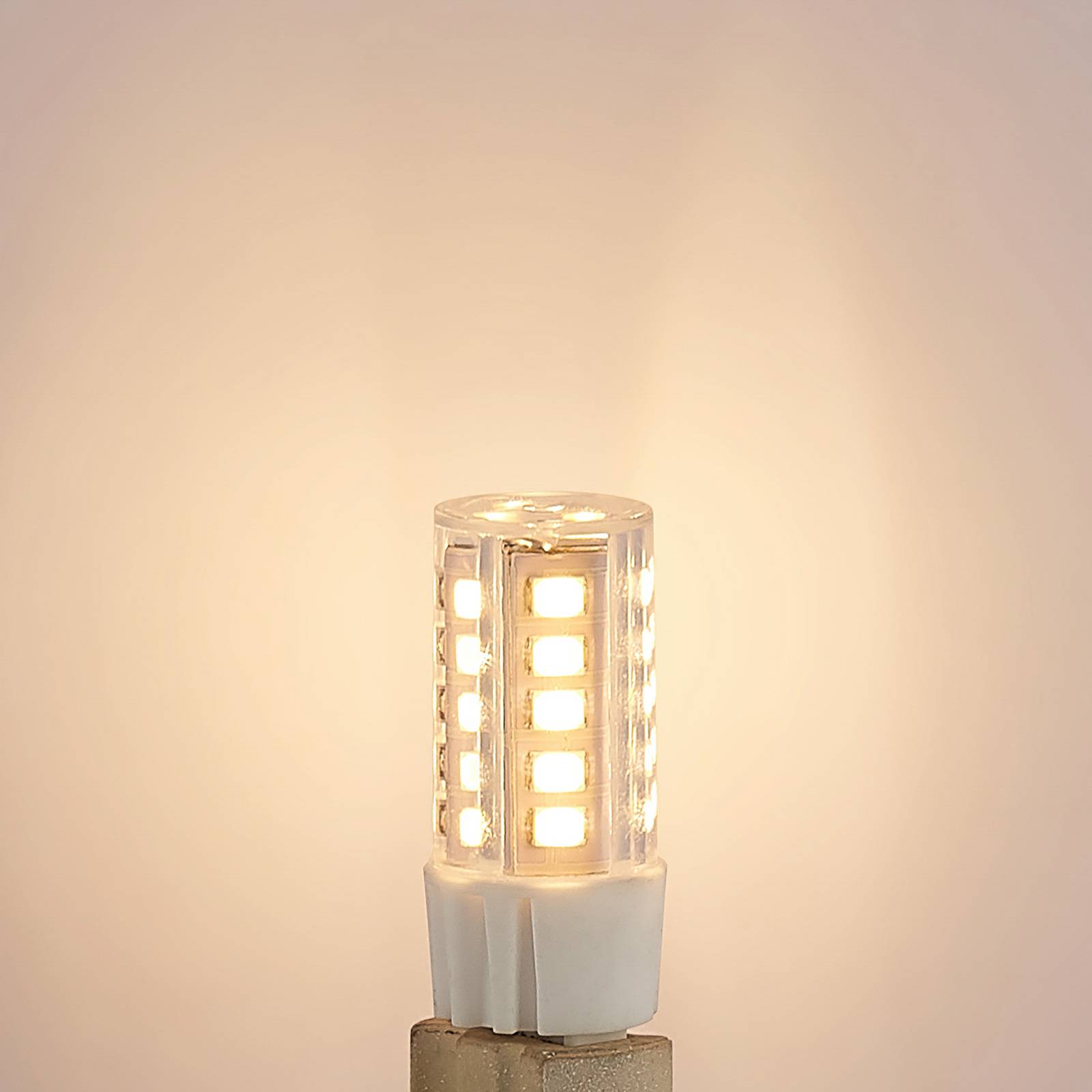 G9 LED pin-base lamp 3,5 W met dimfunctie en warm wit licht De lichtsterkte van deze G9 LED lamp kan worden aangepast via een faseregeling of fase-afsnijdingsdimmer. De pinvorm kan in veel verschillende armaturen worden gebruikt. De LED-technologie is zuinig in verbruik en zorgt voor een goede verlichting. – lichtkleur warm wit 2.700 K – dimbaar