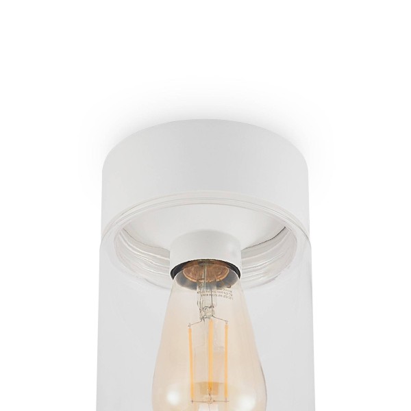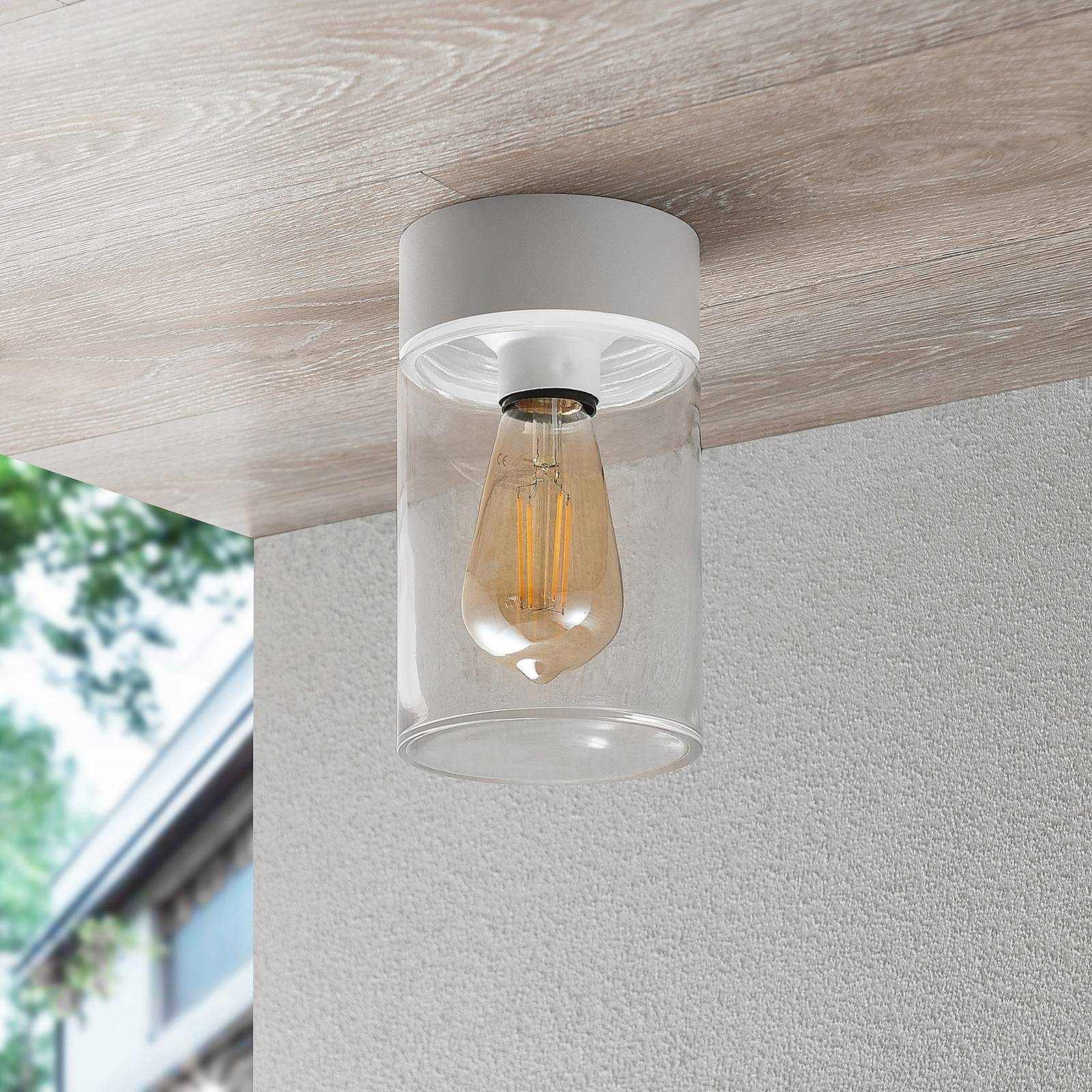 Cilindrische buiten plafondlamp Liljana met heldere glazen kap, IP65 Liljana overtuigt met een relatief eenvoudige look, waarin overbodige details opzettelijk zijn weggelaten. De plafondlamp voor overdekte buitenruimten, b.v. terrassen, huisingangen en balkons, is vormgegeven als een buis, waarbij de witte plafondbeugel net zo breed is als de glazen kap in het onderste gedeelte. Deze heeft een doorzichtig oppervlak, zodat het zicht op de lichtbron niet wordt belemmerd, en moet worden gekozen met een bijpassend uiterlijk. Daarom passen filament- en rustieke gloeilampen met energiebesparende LED-technologie perfect bij deze plafondlamp voor buiten met E27 fitting. De beschermingsklasse IP65 geeft aan dat Liljana uitstekend beschermd is tegen vocht en vuil en zonder aarzeling buiten kan worden gebruikt.