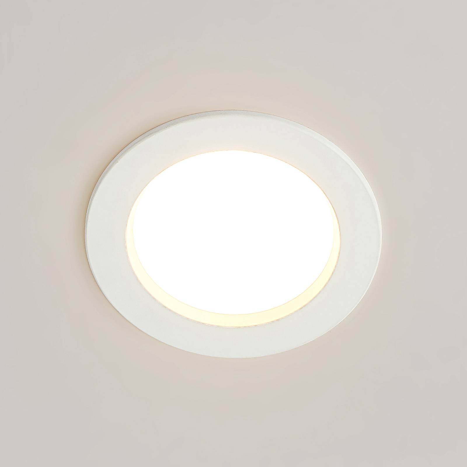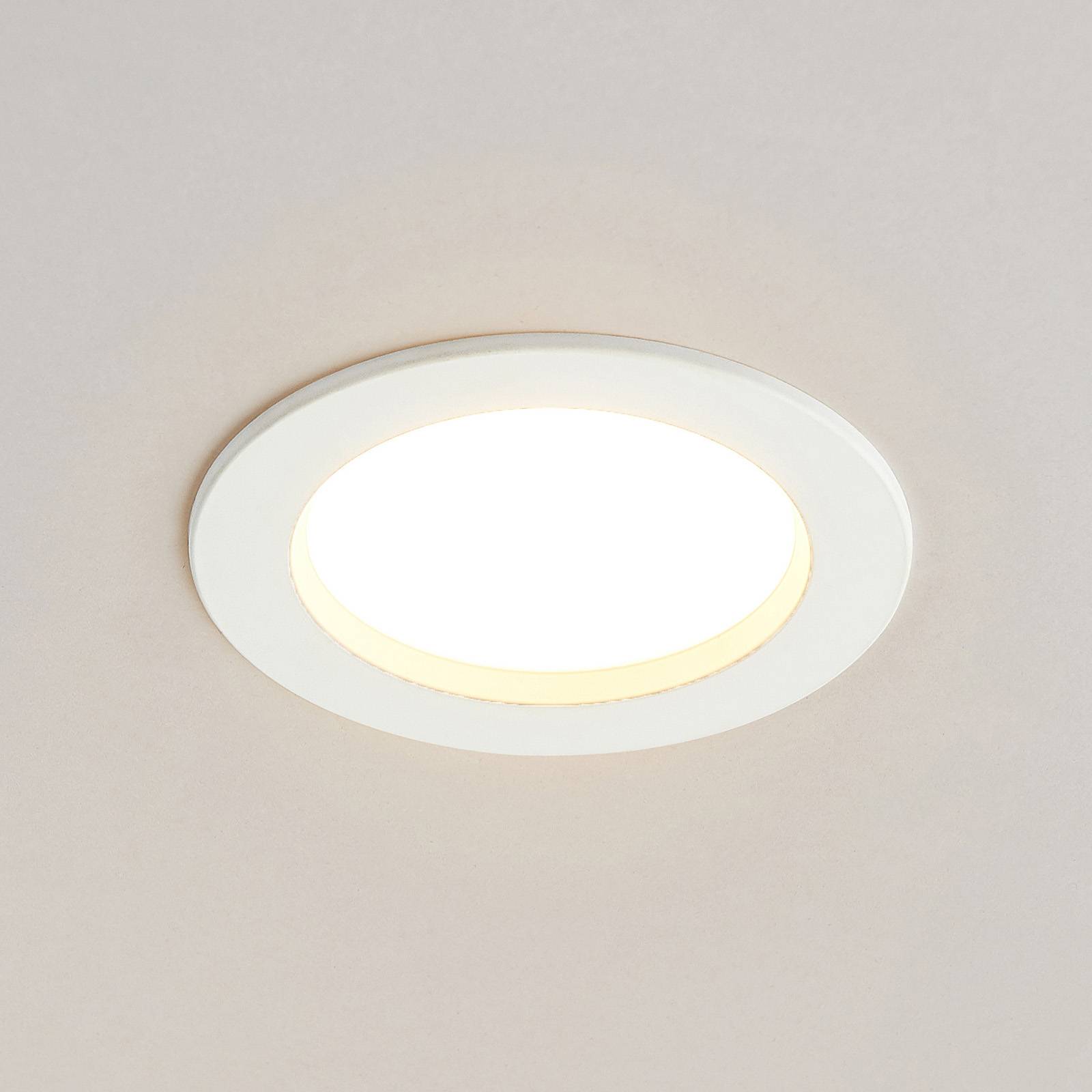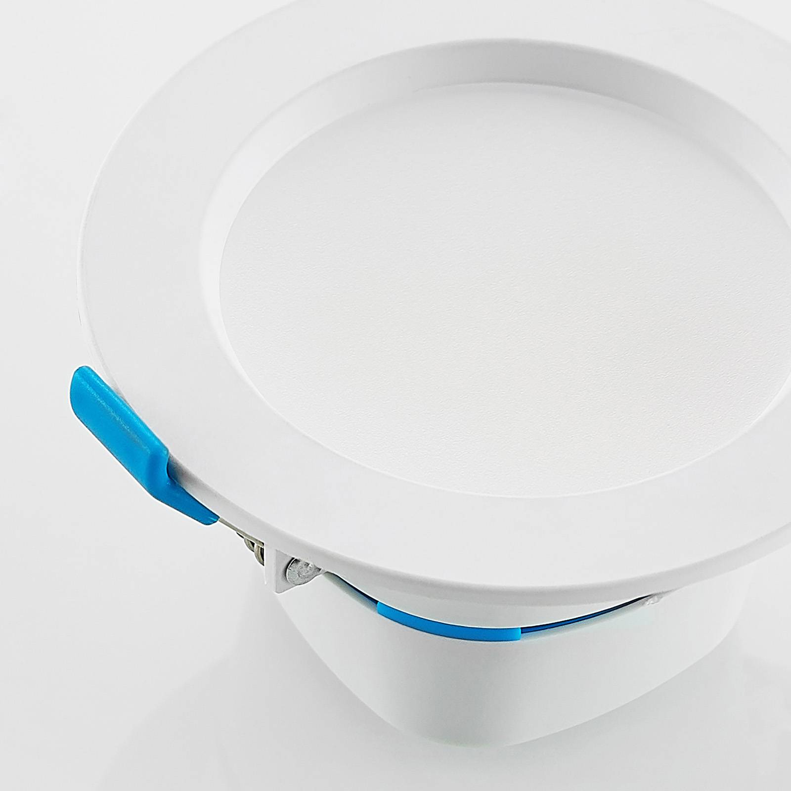 Rond LED inbouwarmatuur Milaine met wit kunststof frame en lichtkleur instelbaar vóór montage Milaine is een veelzijdige LED-inbouwarmatuur met vele voordelen. Het ronde ontwerp met het witte oppervlak ziet er buitengewoon eenvoudig uit en kan bijna overal worden gebruikt. Hij kan zowel in een commerciële als in een privé-omgeving worden gebruikt en zelfs vochtige ruimten kunnen probleemloos met deze discrete inbouwspot worden uitgerust, dankzij de IP44-beschermingsgraad. De lichtkleur kan op drie niveaus worden ingesteld voordat de armatuur in het plafond wordt ingebouwd, aangezien de behuizing van de inbouwarmatuur is voorzien van een DIP-schakelaar. Met een stralingshoek van 100° wordt het licht vrij breed verspreid, zodat zelfs een groter gebied goed kan worden verlicht met Milaine. Voor een aansluiting van meerdere armaturen van dit type is er de praktische optie van doorvoerbedrading. – SDCM < 5 - UGR < 25 Bekijk productspecificaties