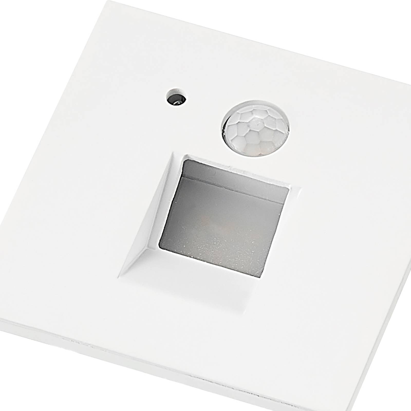 Witte LED-inbouwarmatuur Neru in hoekig design met bewegingssensor Een uitnodigende trap heeft aantrekkelijke verlichting nodig, zodat ze ook in het donker perfect in scène wordt gezet. De Neru LED-inbouwarmatuur kan de vereiste verlichting leveren en heeft een eenvoudig uiterlijk dat discrete accenten zet op vlakke wanden. Het armatuurlichaam is van aluminium en is in een harmonieus wit gehouden. Na de installatie blijft van de LED-inbouwarmatuur alleen nog een slank vierkantje op het oppervlak van de muur over. De vast geïnstalleerde LED’s genereren een warmwitte verlichting en de bewegingssensor geeft de armatuur een zekere functionaliteit.