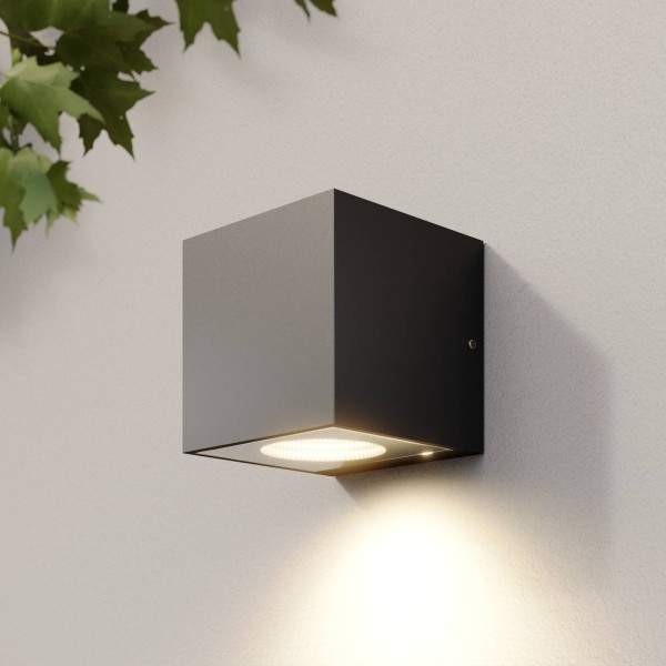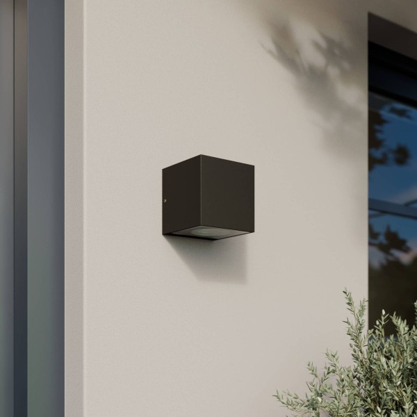 LED buiten wandlamp Tassnim met kubusoptiek in grafiet De LED buiten wandlamp staat voor een stijlvol en modern ontwerp. Het armatuur doet denken aan een kubus en is gemaakt van grafietkleurig aluminium. Binnenin bevindt zich een vaste LED, die warmwit licht produceert en zo voor de juiste sfeer zorgt. De armatuur is stofdicht en beschermd tegen spuitwater dankzij de IP65-beschermingsgraad, waardoor ze perfect geschikt is voor montage buiten. Het compacte en discrete uiterlijk integreert zich moeiteloos met de bouwstijl en is daarom ideaal voor montage op een buitenwand. De Tassnim LED buiten wandlamp is daarom optimaal geschikt voor het verlichting van een oprit of terras en zorgt voor discrete accenten.