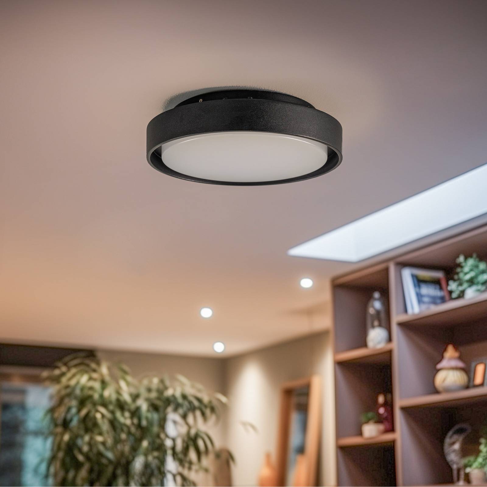 Ronde 60107 LED plafondarmatuur voor binnen en buiten In woonkamers, lounges, sanitaire ruimtes of buiten – de LED plafondarmatuur 60107 zorgt voor een breed, effectief licht. De ronde armatuur bestaat uit een zwart gelakt aluminium frame dat een matte acryl diffuser omsluit. Dit laatste zorgt voor een brede en niet-verblindende lichtbundel. – stralingshoek: 110° – beschermingsklasse: IP54 – inclusief voorschakelapparatuur