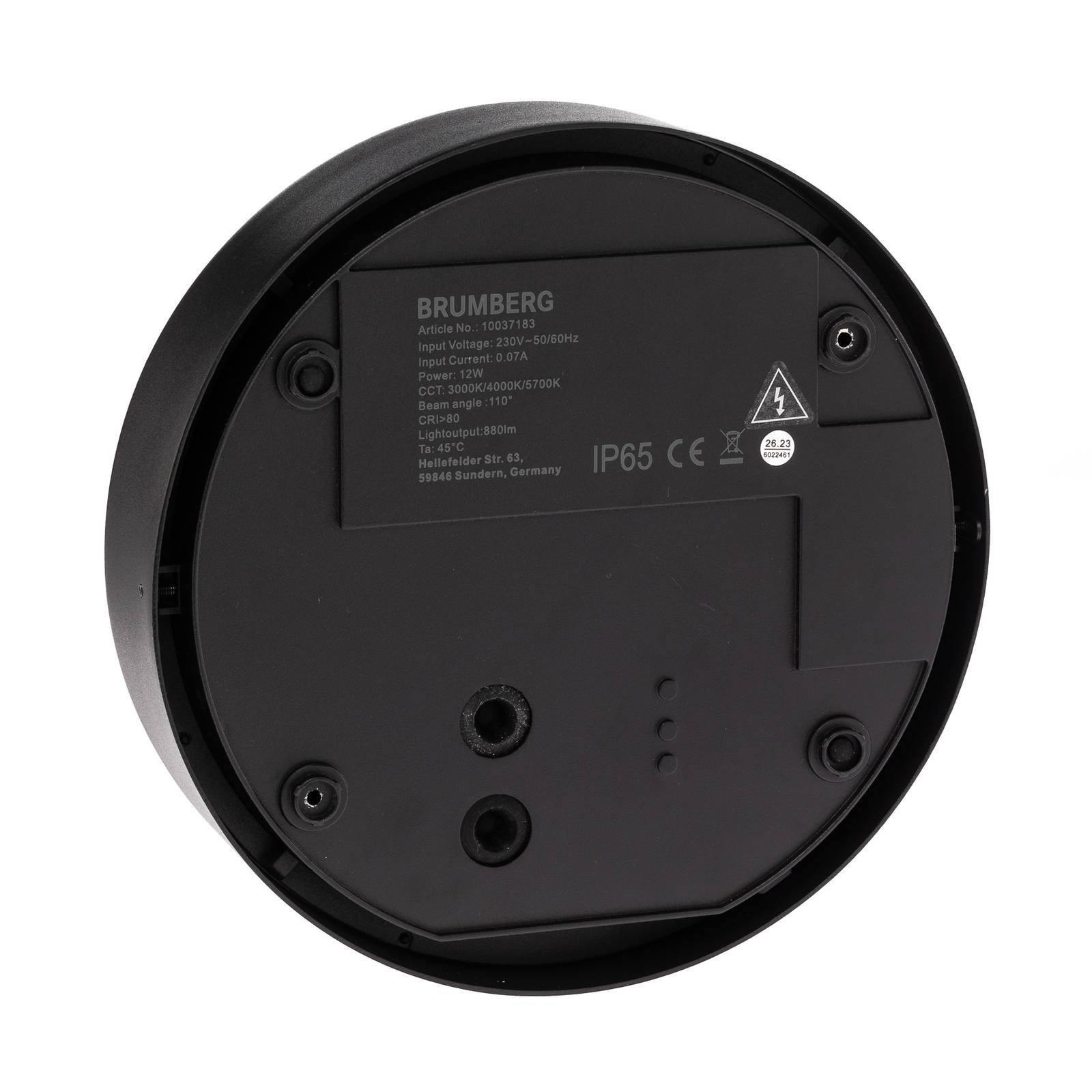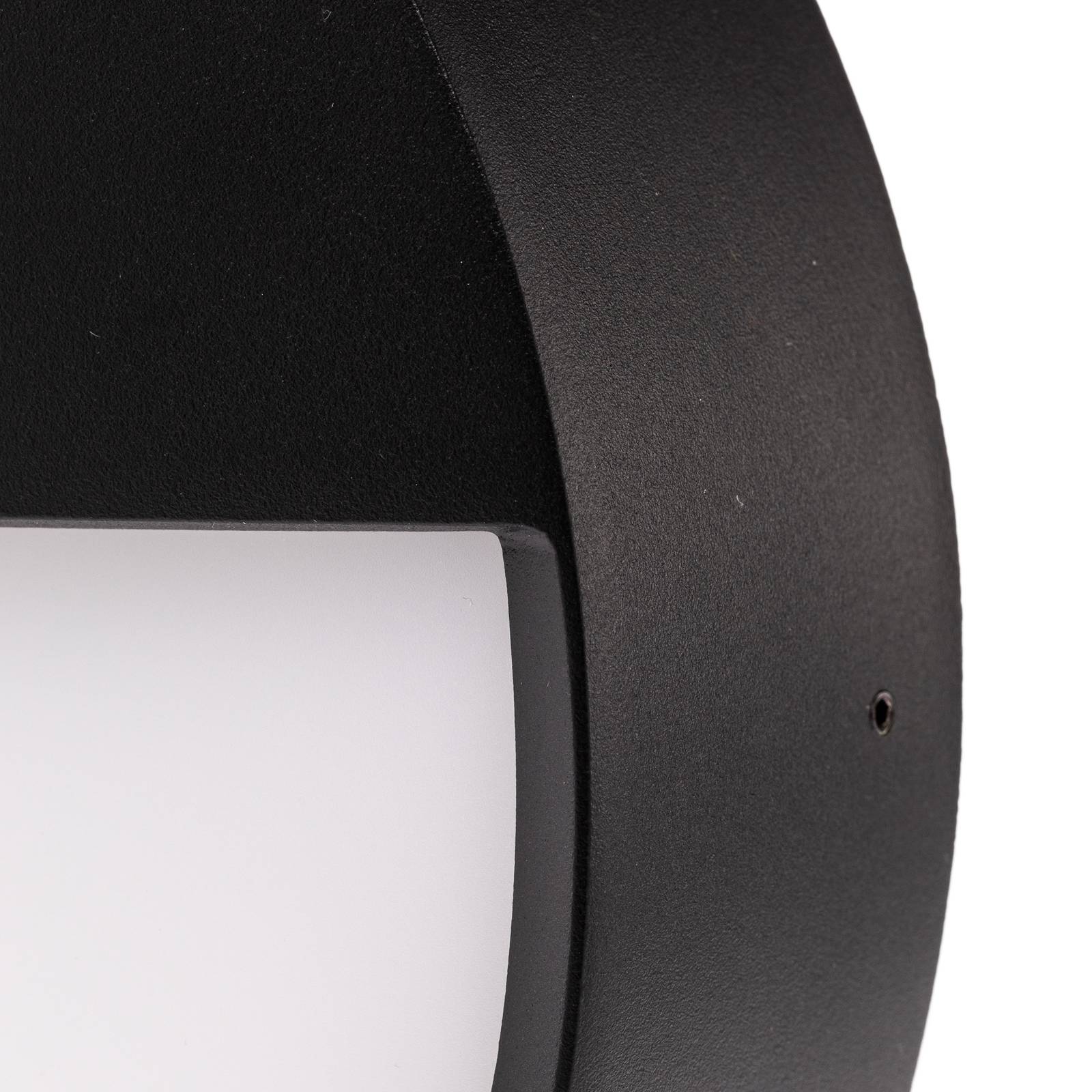 Ronde LED wandlamp Eye met halfbedekte diffuser In deze versie van wandlamp Eye, geschikt voor buitenmontage, is de ronde diffuser van wit kunststof aan de bovenkant bedekt – als door een ooglid. Het frame is gemaakt van aluminium met een mat zwart oppervlak. Vóór montage kan de kleurtemperatuur van de LED-lamp worden ingesteld op 3.000 K, 4.000 K of 5.700 K, afhankelijk van de vereisten en het toepassingsgebied – Bedieningsapparatuur inbegrepen – Kleurtemperatuur selecteerbaar vóór montage