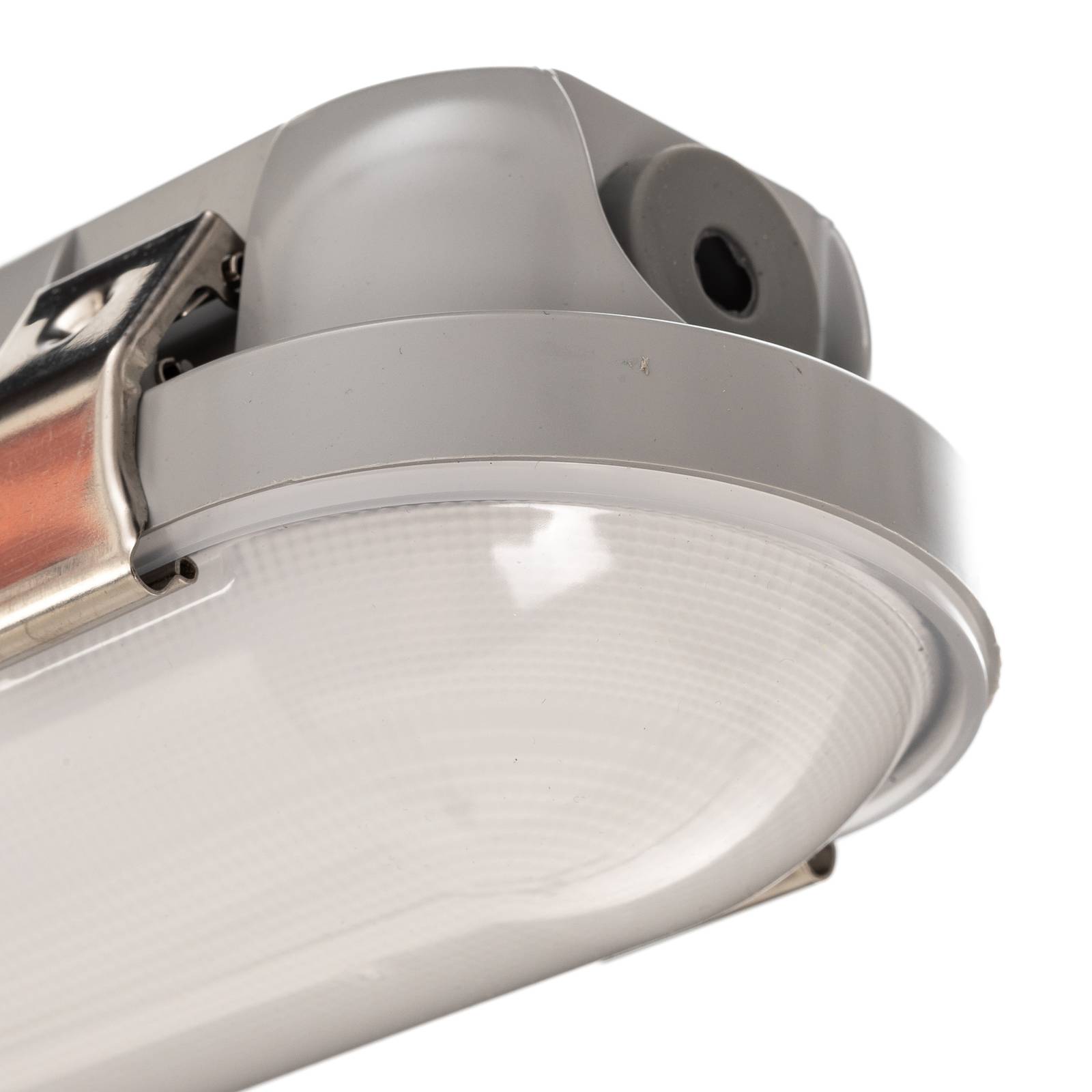 Resistent LED vochtbestendig roosterarmatuur Humid OneHet LED vochtbestendig roosterarmatuur Humid One is gemaakt van resistent polycarbonaat en roestvrijstalen elementen. Het kan zowel aan het plafond als aan de wand worden gemonteerd en is een betrouwbare lichtbron, bijvoorbeeld in parkeergarages of werkplaatsen.Dankzij speciaal geplaatste, zeer breed verspreide en krachtige LED’s wordt een optimale, symmetrische lichtverdeling bereikt met een laag verbruik. De Humid One LED diffuserarmatuur met lange levensduur produceert een universeel wit licht en kan veilig worden gebruikt bij omgevingstemperaturen tussen -20° en 40° Celsius.- Extreem brede stralingshoek (ca. 115°)- Tolerantie voor kleurlocatie (initiële MacAdam): 5- Hoge schokbestendigheid (IK08)- Stofdicht en beschermd tegen waterstralen (IP65)- Inclusief omvormer voor aansluiting op 230 V netspanning (schakelbaar)