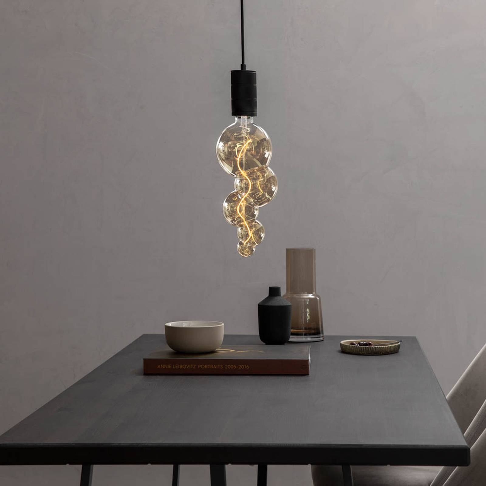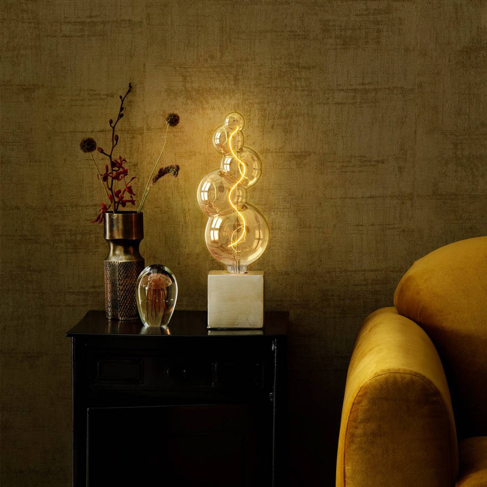 LED-lamp Alicante E27 4W van Calex in indrukwekkende vormJe zou de vorm van deze LED-lamp van Calex kunnen omschrijven als een aaneenschakeling van zeepbellen. Elke lamp zonder kap wordt bij gebruik van deze lichtbron het hoogtepunt van een kamer, al dan niet verlicht. De gouden coating en de LED’s die als filigraandraden in de glazen bubbels zijn aangebracht, doen de rest om de lamp dat beetje extra te geven.