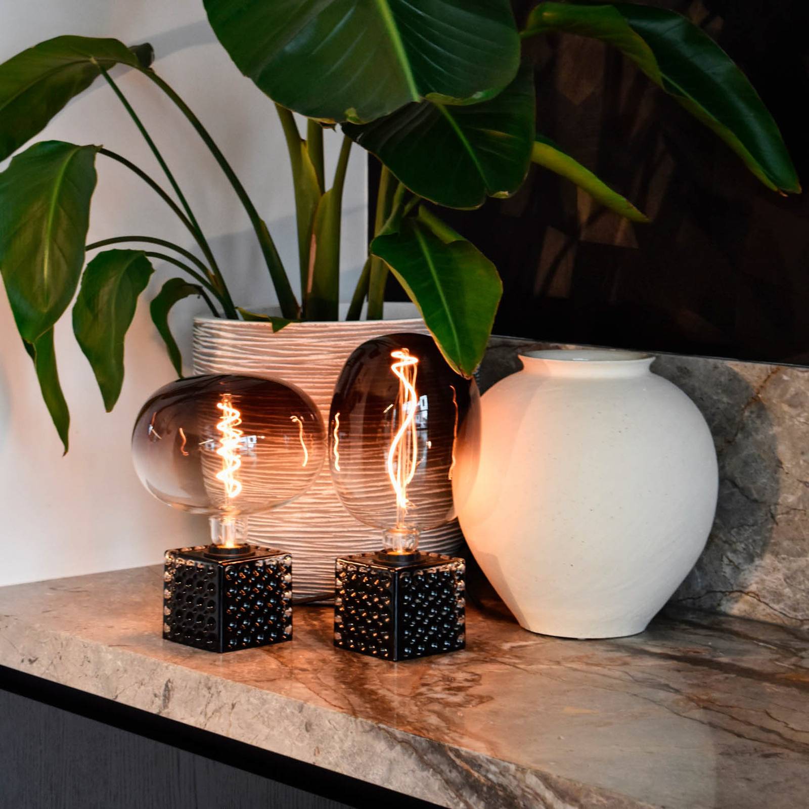 LED glaslamp vloer E27 5W filament in decoratieve lookDeze decoratieve LED lamp met gekleurd glas en spiraalvormige LED filamenten zorgt voor een bijzonder gezellige, extra warme verlichting en is ideaal voor alle schaduwloze armaturen. Afzonderlijk of in combinatie met meerdere lampen van dezelfde of verschillende vormen uit de serie wordt ze een highlight in tafelarmaturen of pendelarmaturen. – bijzonder goede kleurweergave Ra90