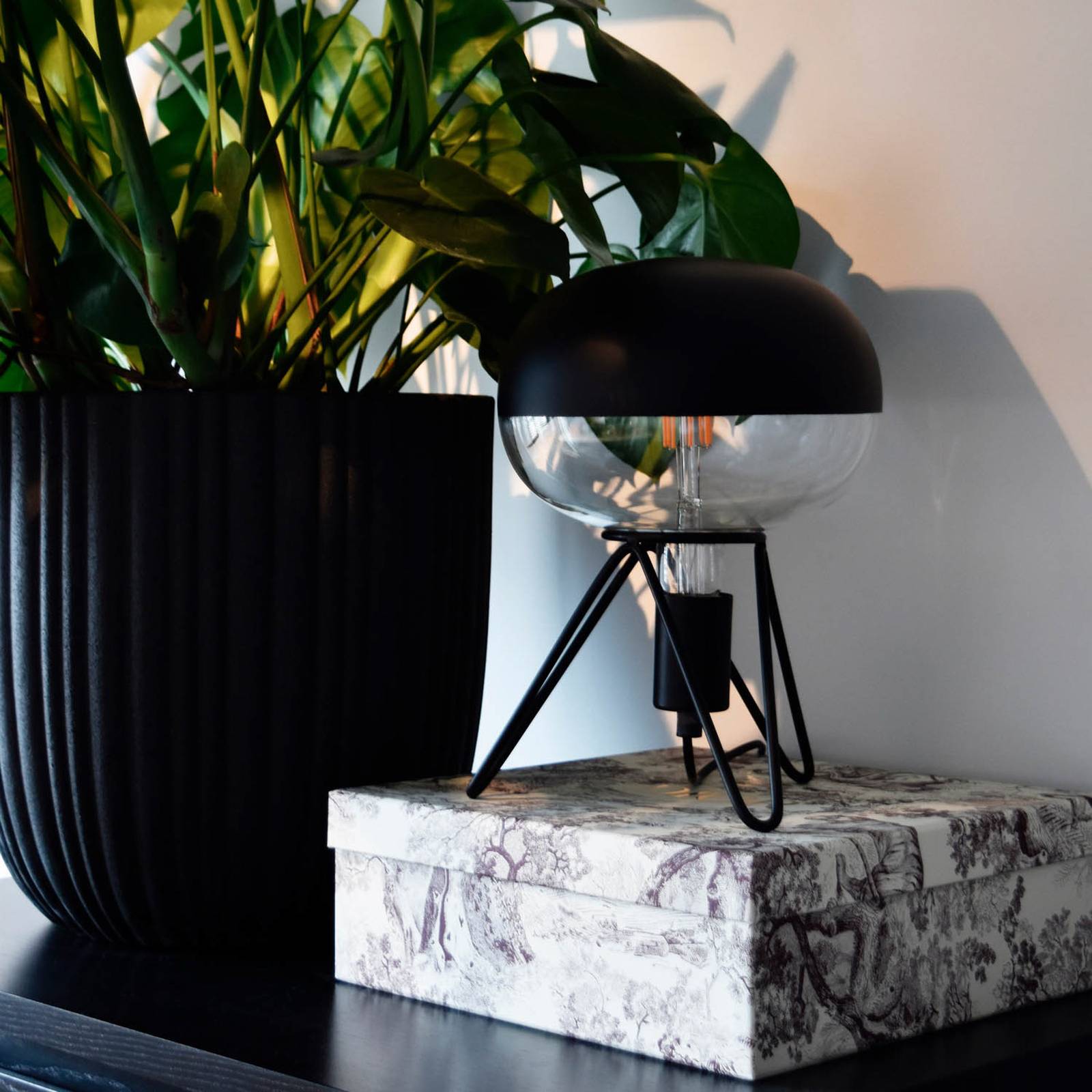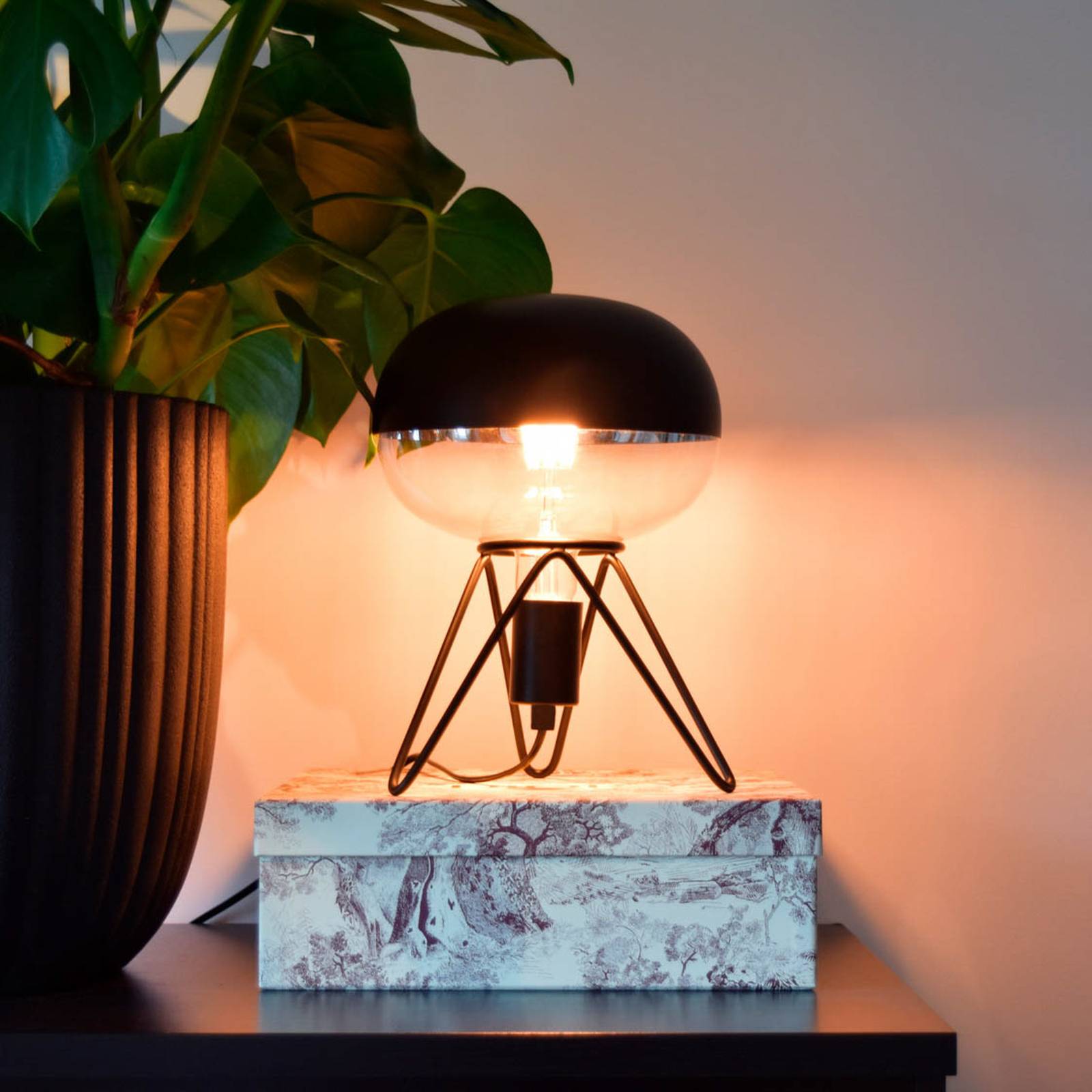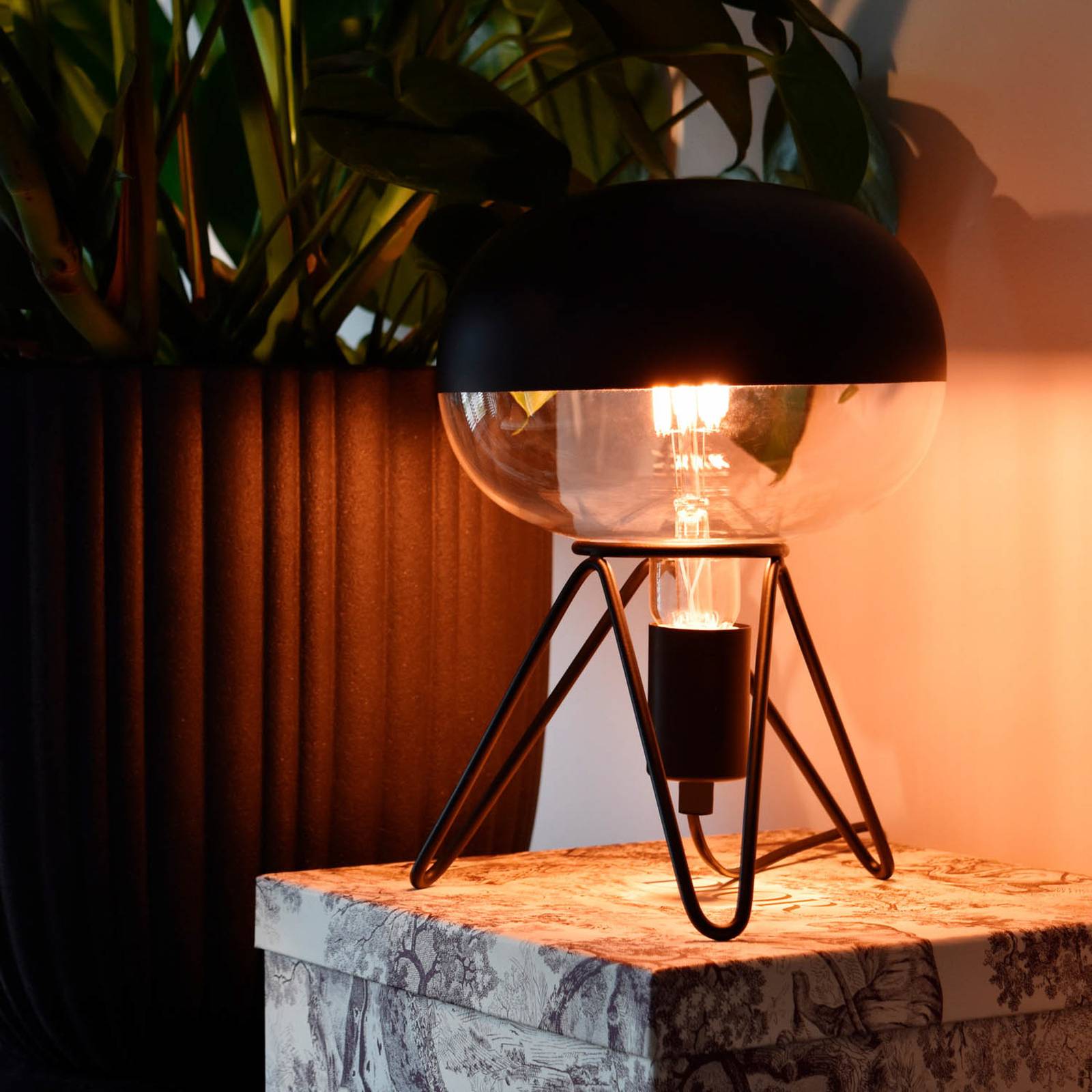 Grote LED lamp Boden Top, kopspiegellamp in zwart, E27 6WDeze grote LED lamp, ontworpen in een licht afgeplatte bolvorm, straalt het licht door de mat zwarte kopspiegel uitsluitend in de richting van de fitting, waardoor indirect licht ontstaat dat niet verblindt. Ze is zowel geschikt voor gebruik in een tafellamp of vloerlamp als in een hanglamphouder.