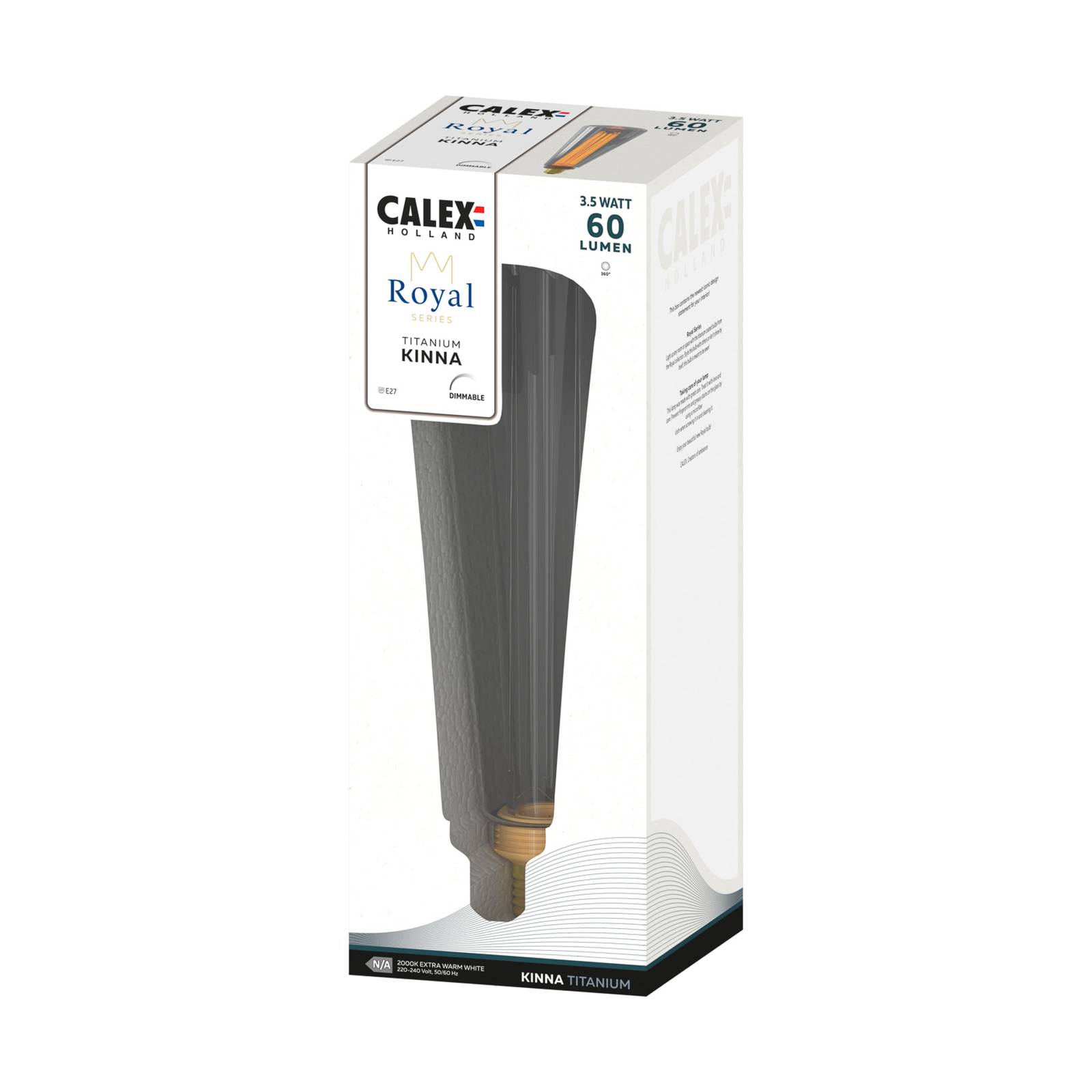 Dimbare LED lamp XXL Royal Kinna Filament met rookgrijze tint, 3,5 W, 2.000 K Elegante gloeidraden vormen het hart van de Royal Kinna LED lamp, De Royal serie is een verzameling elegante, grote lampen die elke ruimte een luxueuze uitstraling geven. De lampen met XXL-formaat hebben een statige, rechte gloeidraad die prachtig licht geeft en perfect past bij een chic interieur. Met een bijzonder warme lichtkleur creëert deze elegante lamp een zeer aangename sfeer. De rookgrijze coating zorgt ervoor dat deze moderne E27 lamp in bijna elk interieur past. Kinna is een opvallend hoogtepunt dat het middelpunt van een kamer kan zijn en een gevoel van grandeur en verfijning uitstraalt. Met de Royal Kinna of een van de andere lampen uit de Royal serie van Calex geeft u uw interieur gegarandeerd een bijzonder luxe uitstraling. – dimbaar