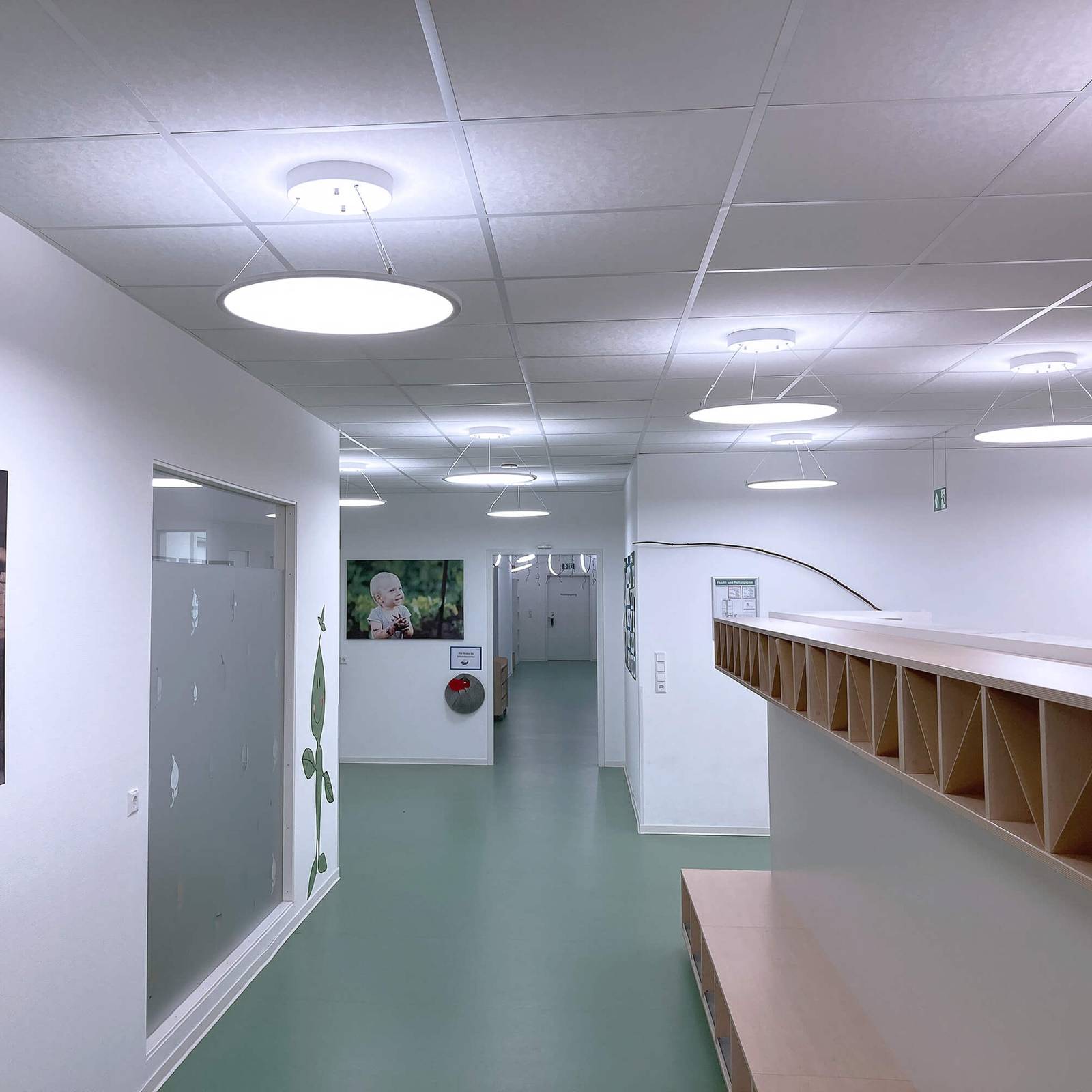Kantoorgeschikte LED pendelarmatuur, helder met buitengewoon design Het bijzondere aan deze moderne LED pendelarmatuur is het bijna transparante armatuurlichaam. Deze is bijna transparant wanneer hij is uitgeschakeld en produceert een helder, niet-verblindend licht wanneer hij is ingeschakeld. Dankzij de verblindingswaarde van UGR
