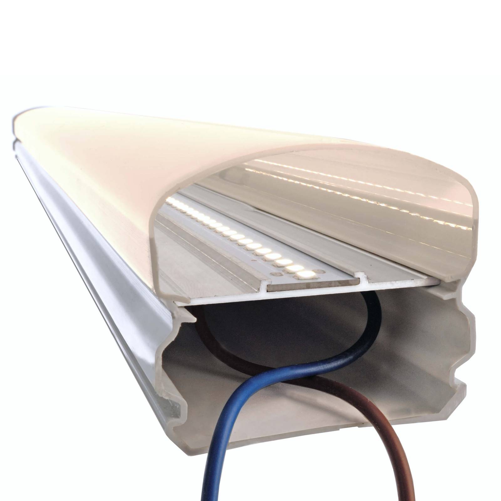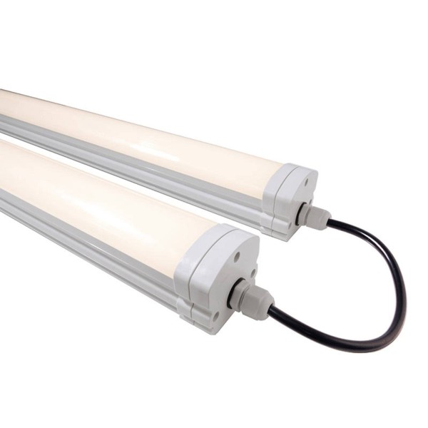 129,6 cm lange LED-vochtwerende lamp Tri Proof De Tri Proof LED-vochtwerende armatuur kan als plafond- of wandarmatuur worden gemonteerd en kan dankzij terminals aan beide zijden in serie worden geschakeld. Er kunnen dus tot 40 armaturen achter elkaar worden gemonteerd. – Lichtkleur universeel wit (4.000 K) – Beschermingsklasse IP65 – Polycarbonaat behuizing, lichtgrijs – satijnen polycarbonaathoes – uitgerust met een eenvoudige elektrische aansluiting met stekkeraansluitklem, geschikt voor verdere bedrading