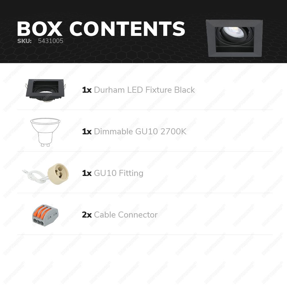 De Durham LED inbouwspot is kantelbaar waardoor de lichtbundel naar specifieke ruimtes gericht kan worden, ook zit de GU10 LED spot iets verzonken in het armatuur waardoor je niet ogenblikkelijk in de lichtbron kijkt. Deze inbouwspot is geëffectueerd in de kleur zwart en wit maar is mede mede verkrijgbaar in een aluminium geborstelde (RVS look) uitvoering. Een profijt van deze LED spot is dat de GU10 spot welke in het armatuur zit verwisselen kan worden. Het bestellen van een geheel gloednieuwe LED inbouwspot is dus niet nodig. Je kunt probleemloos de GU10 spot uit het armatuur halen en variëren voor een andere GU10 spot. Het aansluiten van de LED spot is heel genoeglijk op het lichtnet van 230 Volt.