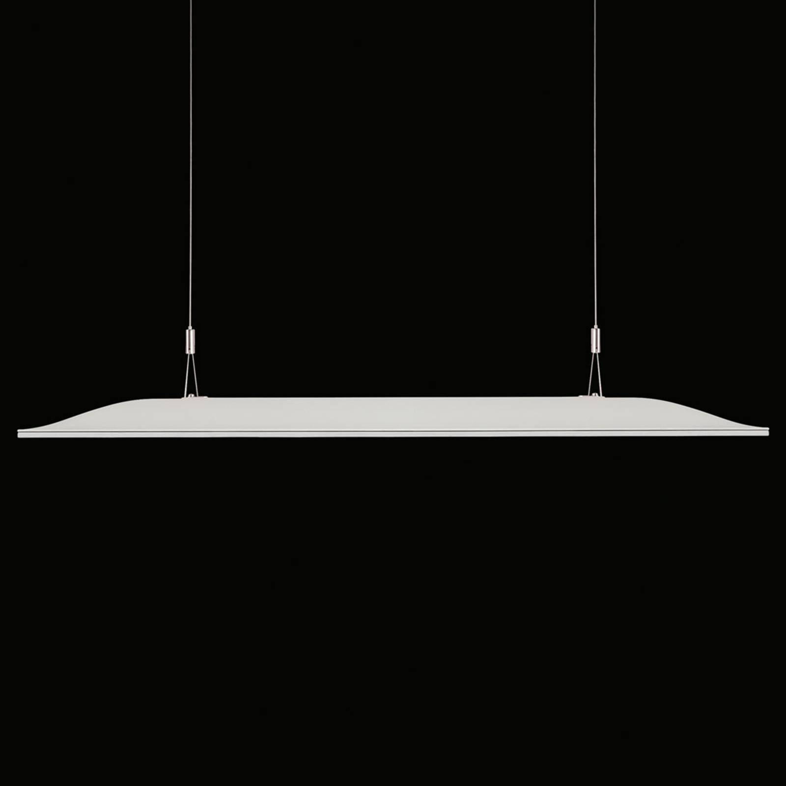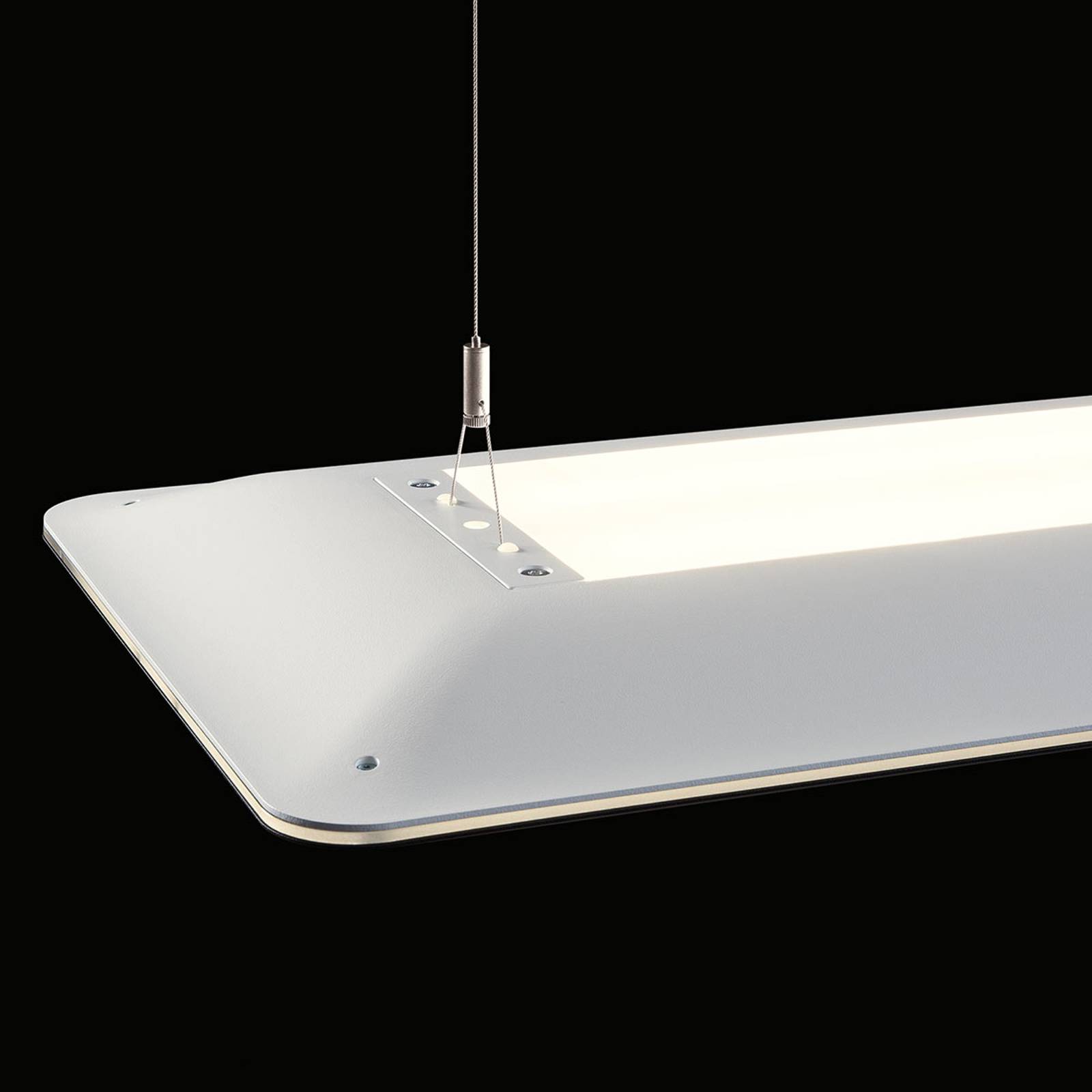 Het pasvorm van de Dome LED-pendelarmatuur is een symbiose van praktisch design, vloeiende overgangen en heldere randen: Enerzijds de zachte bouw van de matte armatuurkop en anderzijds het heldere, glanzende lichtuitstralende oppervlak. De bovenzijde van de armatuurbehuizing is gepoedercoat in mat wit (vergelijkbaar met RAL 9016) en vormt een effectief contrast met de helderheid van het glanzende, reflecterende lichtuitstralende oppervlak eronder. Het armatuur wordt opgehangen via Y-staalkabels, de aansluitkabel is transparant.