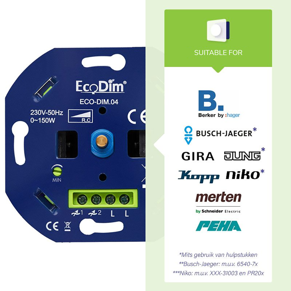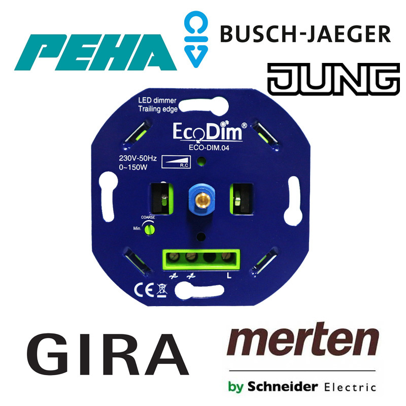De LED dimmer wordt standaard geleverd met 3 hulpstukjes waardoor het misschien wordt om de dimmer achter handig al het bestaande afdekmateriaal in te bouwen. Voor brede merken dienen er hulpstukjes toegevoegd te worden om de dimmer passend te maken, dit staat duidelijk omschreven in de meegeleverde handleiding. Hierdoor is de dimmer bekwaam voor: