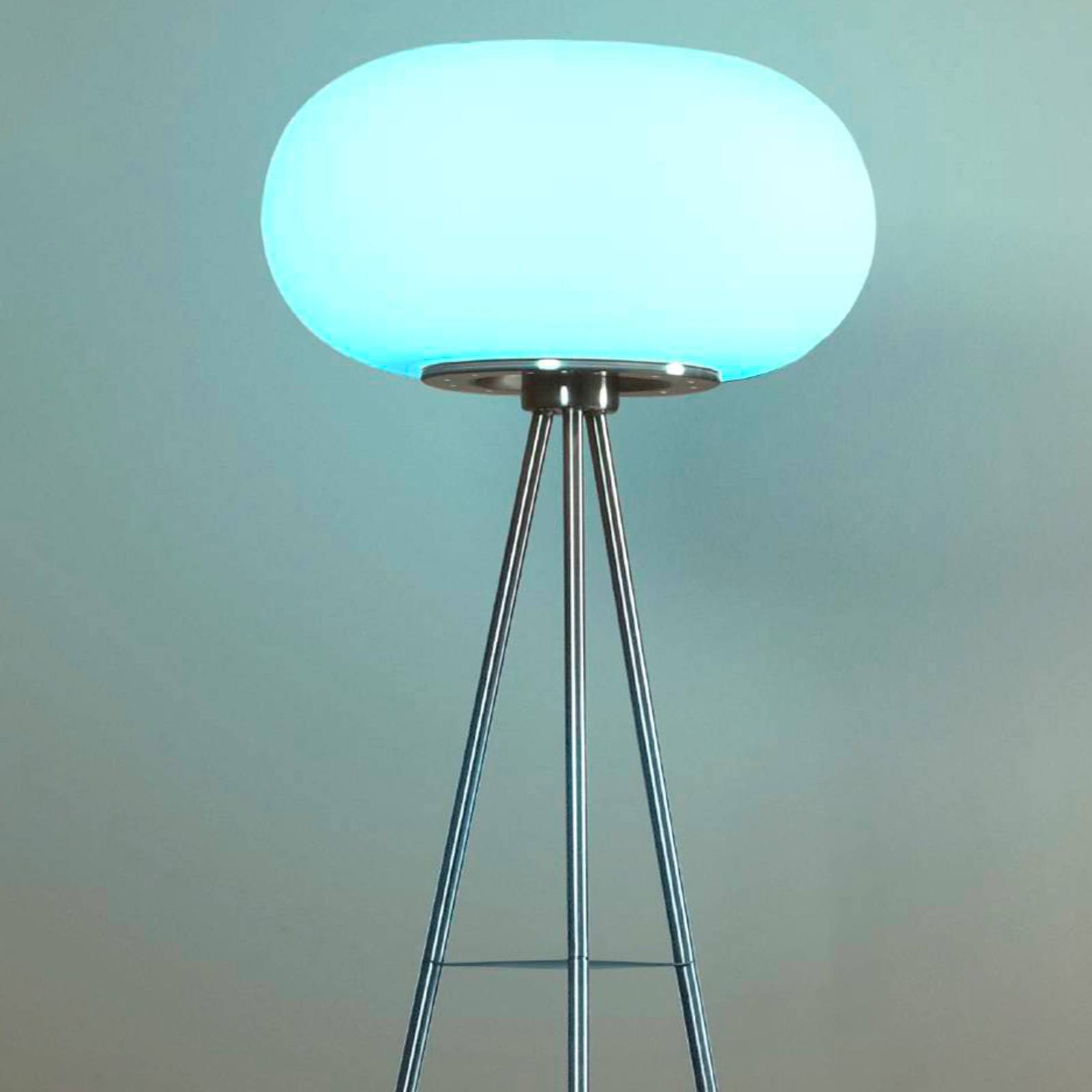 Slimme aanstuurbare LED-vloerlamp Optica-C met driepootframe Met de LED-vloerlamp Optica-C betreedt een verlichtingsobject de woonkamer dat niet alleen decoratief maar ook functioneel veel te bieden heeft. Een lenticulaire kap troont op het mat vernikkelde driepotige stalen frame, dat het licht zacht en gelijkmatig in alle richtingen door het opaalglas verspreidt. Wanneer de lamp via Bluetooth is verbonden met een smartphone/tablet, kan niet alleen de helderheid, maar ook de lichtkleur en kleurtemperatuur via een app worden aangepast om de perfecte sfeer te creëren. Naast deze instelmogelijkheden zijn er talrijke andere functies beschikbaar in de app, zoals aanwezigheidssimulatie of scènekeuze. Functies / compatibiliteit: – Uitgerust met een schakelaar (aan/uit) op de stekkerkabel – Moderne Bluetooth mesh-technologie met beveiligd netwerk en doorgifte van commando’s tussen de toestellen – bedienbaar met gratis Smart Control App van AwoX (beschikbaar voor iOS en Android) – bedienbaar met de bijpassende EGLO connect afstandsbediening (niet meegeleverd) – dimbaar – RGB-kleurregeling – Regeling wit licht: warm wit (2.700 K) – daglicht (6.500 K)