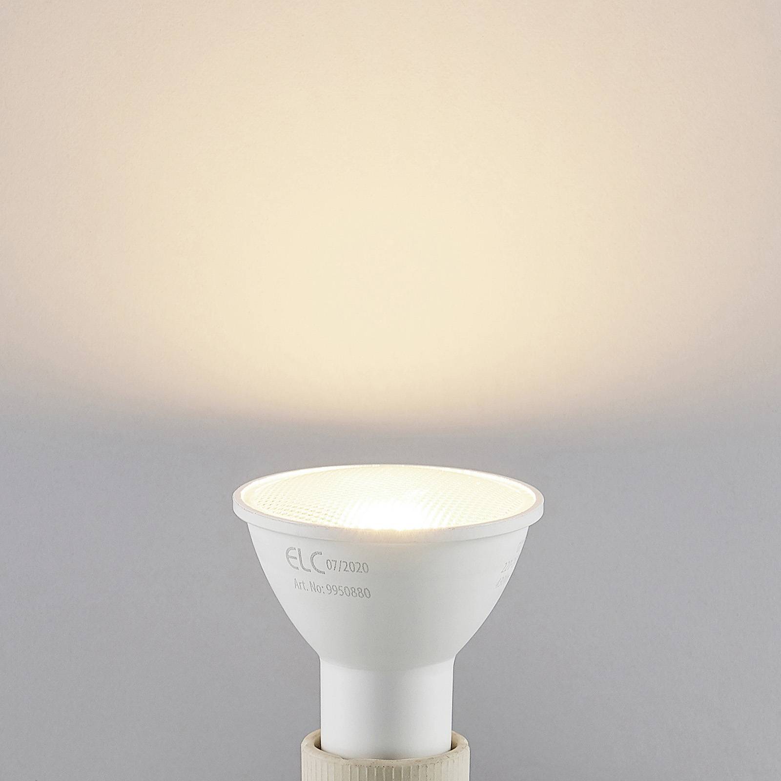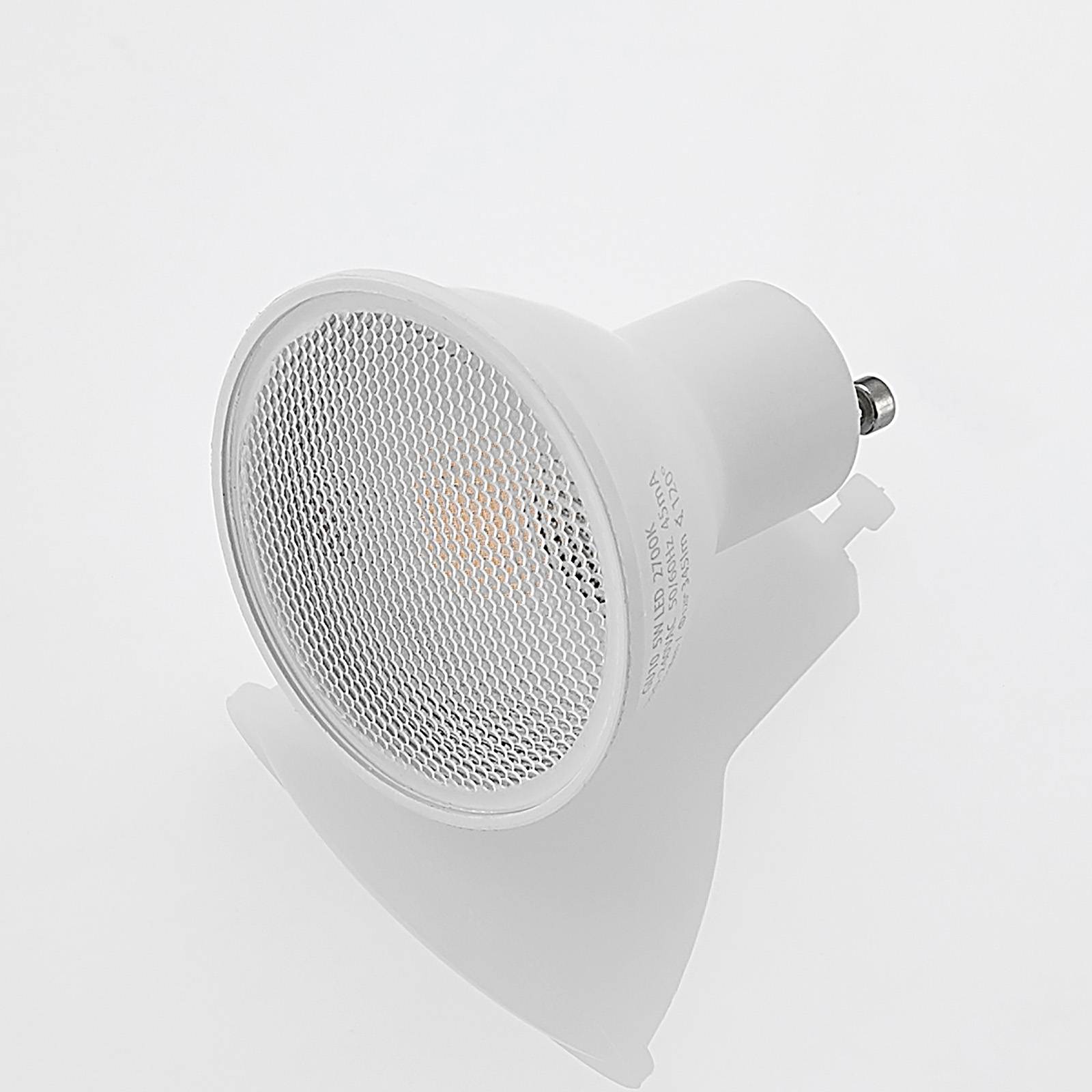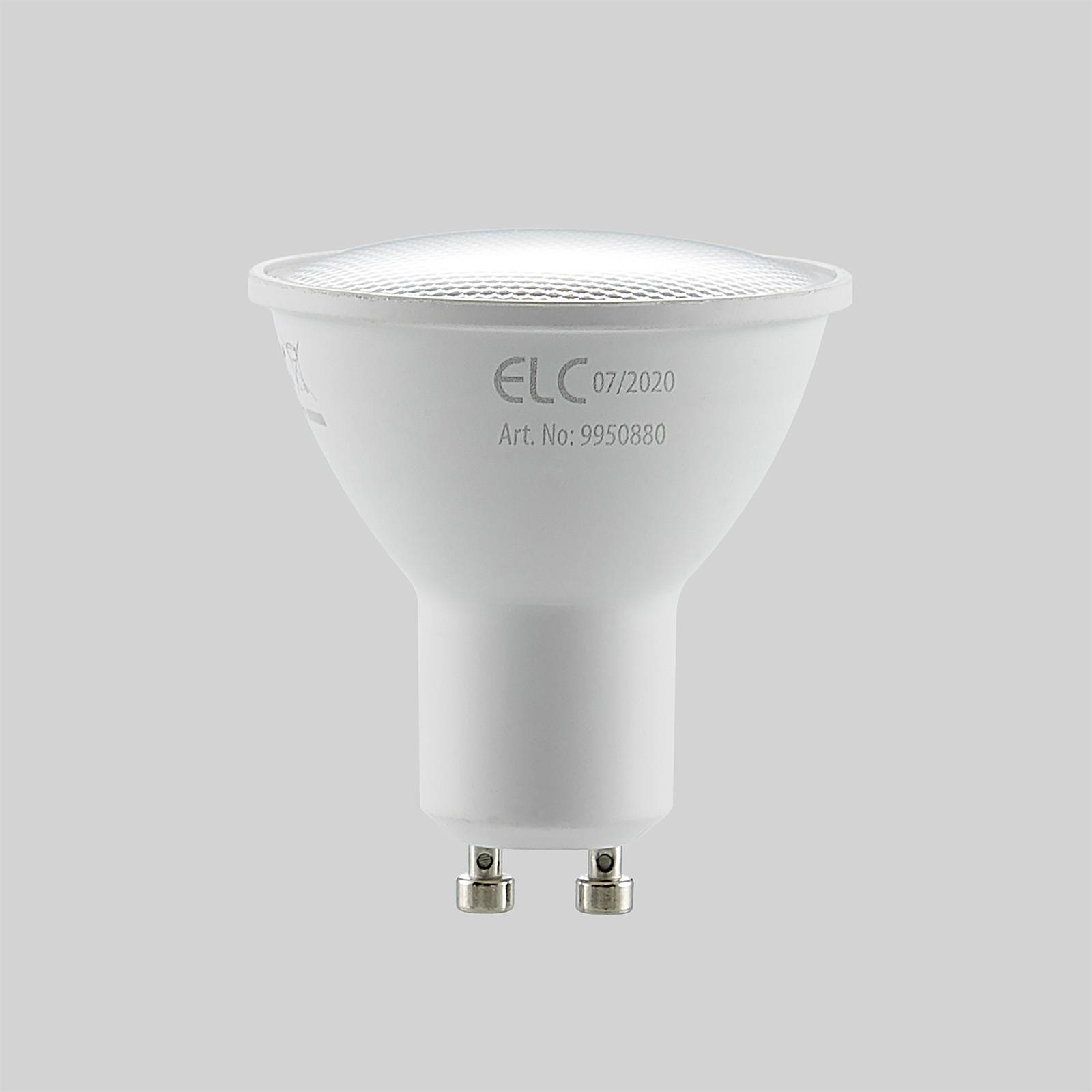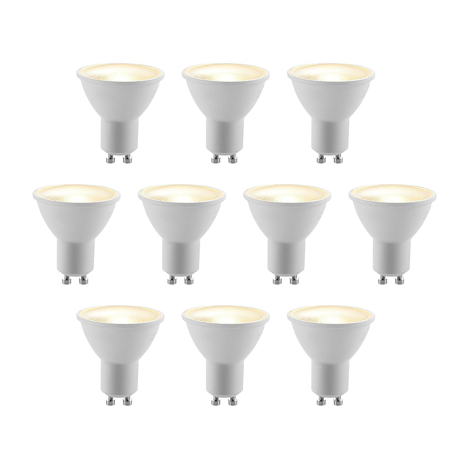 In een verpakking van 10 – LED reflector GU10 5W met satijnen afdekking en warm witte lichtkleur Deze LED reflector GU10 met een opgenomen vermogen van 5 W wordt geleverd in een voordelige en voordelige verpakking van 10 stuks. Qua lichtkleur en ook helderheid is de LED-reflector te vergelijken met een halogeenlamp van ca. 40 W. – niet dimbaar