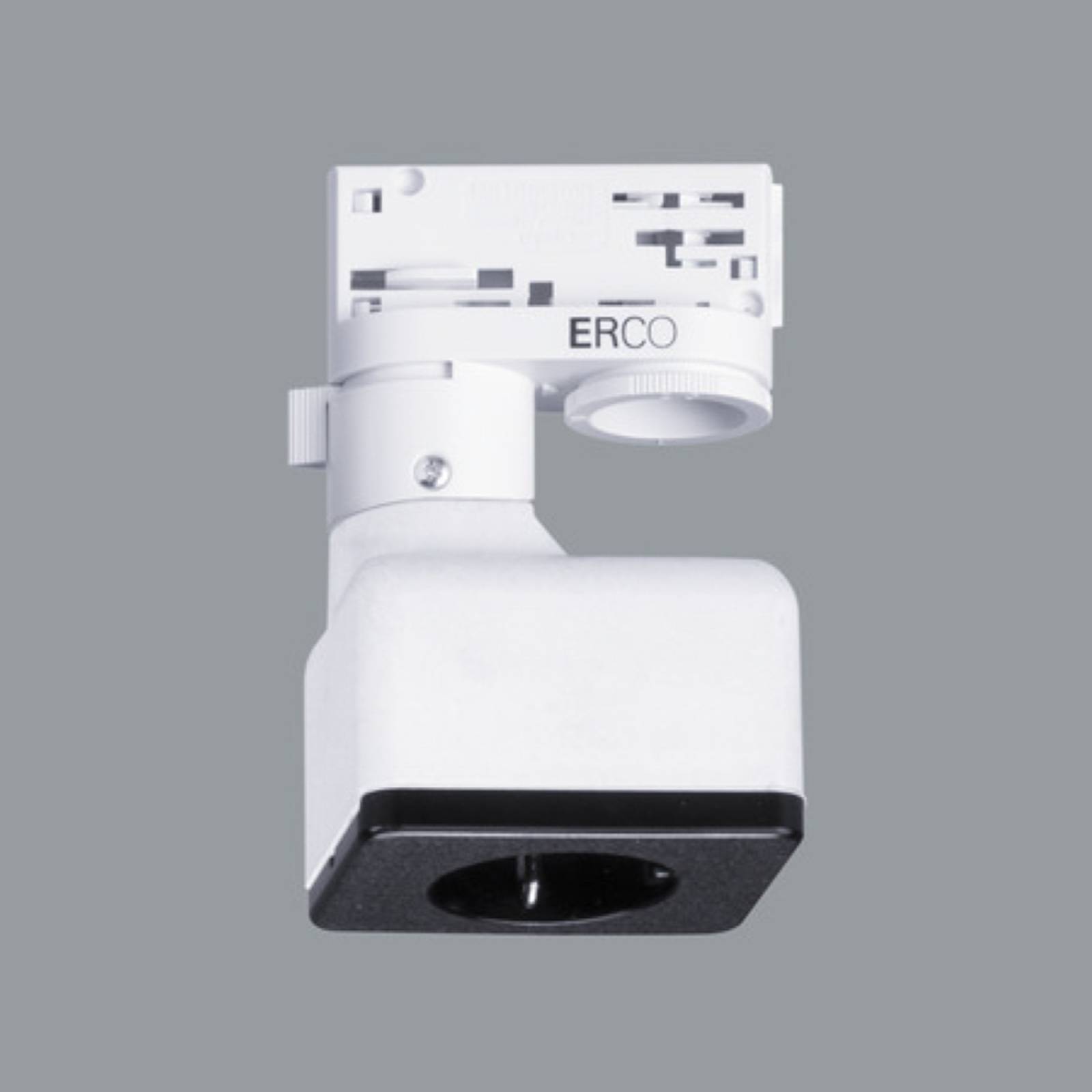 Railadapter voor ERCO 3-fase rail met geïntegreerde Schuko contactdoos Deze 3-fasige railadapter is voorzien van een naar beneden gerichte Schuko-aansluiting direct op de adapter voor het aansluiten van een stekker. – max. 250 V / 10 A – Draagvermogen: max. 10 kg – niet geschikt voor DALI bediening van de baan
