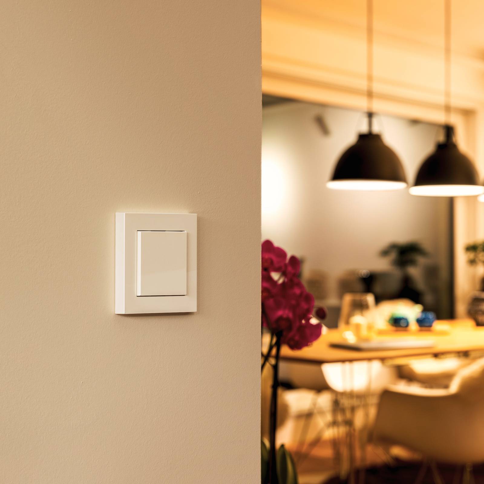 Slimme integratie van conventionele verlichting in Apple HomeKit met de Eve Light Switch met schroefdraad Met de Eve Light Switch wandschakelaar kunnen bestaande armaturen en lampen die normaal gesproken niet Apple HomeKit-enabled zijn in het systeem worden geïntegreerd. U hoeft geen verlichting te vervangen. Bovendien blijft de conventionele, vertrouwde bedienbaarheid via een schakelaar behouden. De lichtschakelaar kan gemakkelijk worden aangepast aan de bestaande armatuur aan de muur en kan in verschillende uitvoeringen worden gemonteerd. De schakelplaat in het formaat 55 x 55 mm past in gangbare frames, zodat de uniforme uitrusting in de ruimte kan worden gehandhaafd. Indien er meerdere schakelaars in een circuit zijn, is het voldoende om slechts één schakelaar te vervangen om de armaturen te kunnen bedienen. Dankzij de compatibiliteit van de wandschakelaar met Apple HomeKit kunnen de functies worden bediend via een app of ook met de spraakassistent Siri. Het is ook mogelijk om scènes te gebruiken. In dit geval worden meerdere apparaten met één commando aangesproken en geactiveerd of gedeactiveerd. Het inschakelen van de plafondlamp in de woonkamer kan bijvoorbeeld worden gecombineerd met het activeren van een tafellamp die is aangesloten op een Eve Energy stopcontact. Eve Light Switch maakt ook schema’s mogelijk die eenvoudig via de app geprogrammeerd kunnen worden. Zo kunt u het schakelen van uw eigen verlichting gemakkelijk automatiseren. De schema’s worden opgeslagen op het apparaat en kunnen worden gecombineerd met tijden en richtlijnen zoals “zonsopgang” of soortgelijke instellingen. Dankzij de thread mogelijkheid kan Eve Light Switch direct gekoppeld worden aan andere HomeKit componenten. Hij kan dus samen met de hele groep worden bestuurd en dient tevens als repeater van het signaal (mesh-netwerk). Functies/compatibiliteit: – bedienbaar met de Eve app of Home app van de Apple HomeKit met huidige iOS versie (met iPhone, iPad of iPod touch) – voor automatisering en toegang op afstand, een HomePod, een Apple TV (of nieuwer) of een iPad geconfigureerd als bedieningscentrum met de huidige iOS-versie – autonoom systeem – geen externe cloud, registratie of profilering – geschikt voor schroefdraad – 55 x 55 mm schakelplaat compatibel met gangbare frames Technische gegevens: – Radioverbinding: Bluetooth Low Energy (max. radiovermogen (EIRP):
