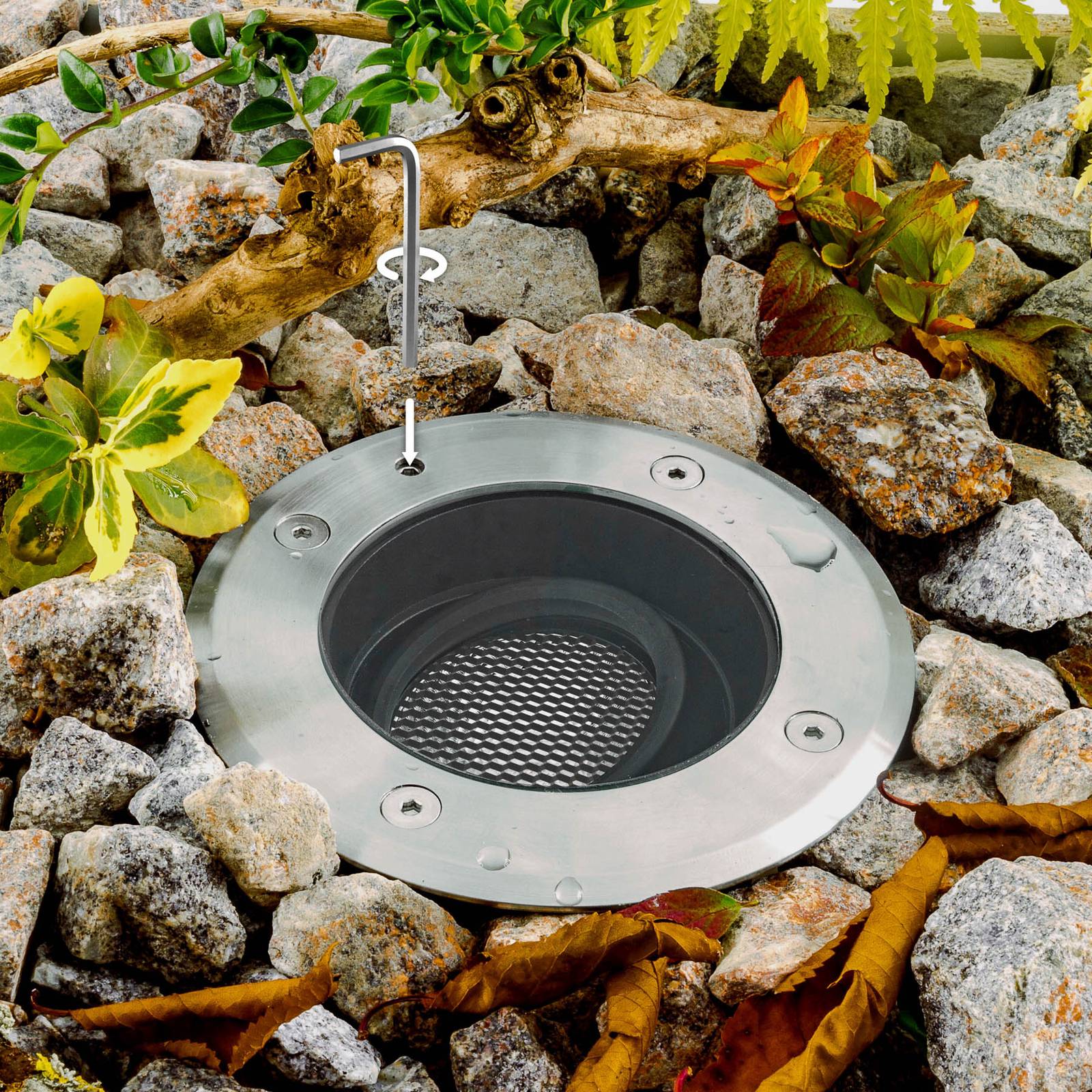 Ronde LED vloerinbouwarmatuur Pentola met voor paden en opritten De Pentola LED vloerinbouwarmatuur is ideaal als aanvulling op een modern verlichtingsconcept in veeleisende buitenlocaties. Hij is gemaakt van een behuizing van massief aluminium met een deksel van V2A roestvrij staal en een helder beschermglas. In overeenstemming met beschermingsklasse IP65 trotseert hij de gevolgen van het weer. Bovendien kan de Pentola een maximale belasting van 1.500 kg dragen en kan er met een snelheid van max. 20 km/u overheen worden gereden. Daarom is de Pentola LED-grondlamp bij uitstek geschikt voor het verlichten van opritten. Bij de levering is een plastic installatiehuls inbegrepen. Een zelfontluchtend ventiel is geïnstalleerd aan de onderzijde van de armatuur om condensatie te voorkomen. – Directe aansluiting op 230 V – Lichtverdeling: symmetrisch – Stralingshoek: 38 – ook na montage zwenkbaar (max. 20°) dankzij geïntegreerde stelschroef – Slagvastheid: IK08