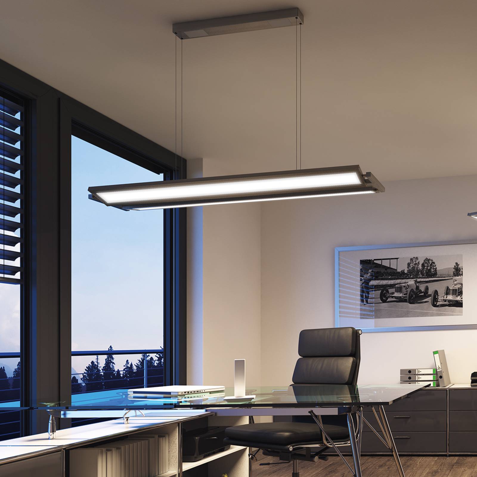 Classic Tec – LED-pendellamp met variabel licht Classic Tec is een LED-pendellamp die een voor een goede sfeer op de werkplek zorgt. De beide lampelementen kunnen in de plafondbevestiging rondom 330° draaien, zodat grote oppervlaktes van de ruimte perfect kunnen worden uitgelicht en een optimale verlichting wordt bereikt. Door het color control systeem kan de lichtkleur bovendien variëren, zodat er alles mogelijk is, van huiselijk warmwit licht tot fel daglicht – en dat heel gemakkelijk via de meegeleverde infrarood afstandsbediening. De LED-pendellamp Classic Tec bestaat uit roestvrij staalkleurig geanodiseerd aluminium en is in Duitsland gemaakt. Het is voorzien van een diffuser dat nagenoeg verblindingsvrij licht met een briljante kleurweergave van Ra85 geeft.