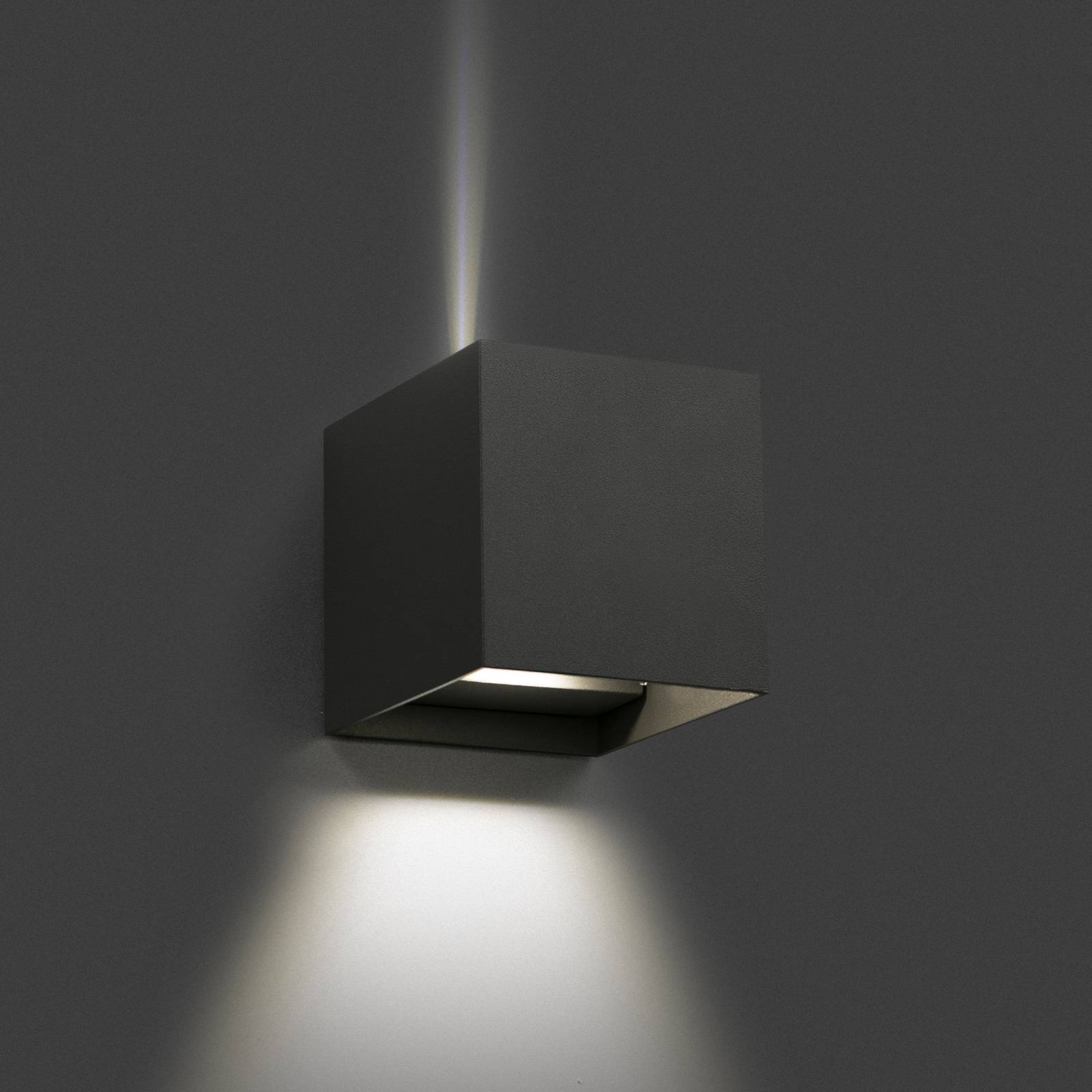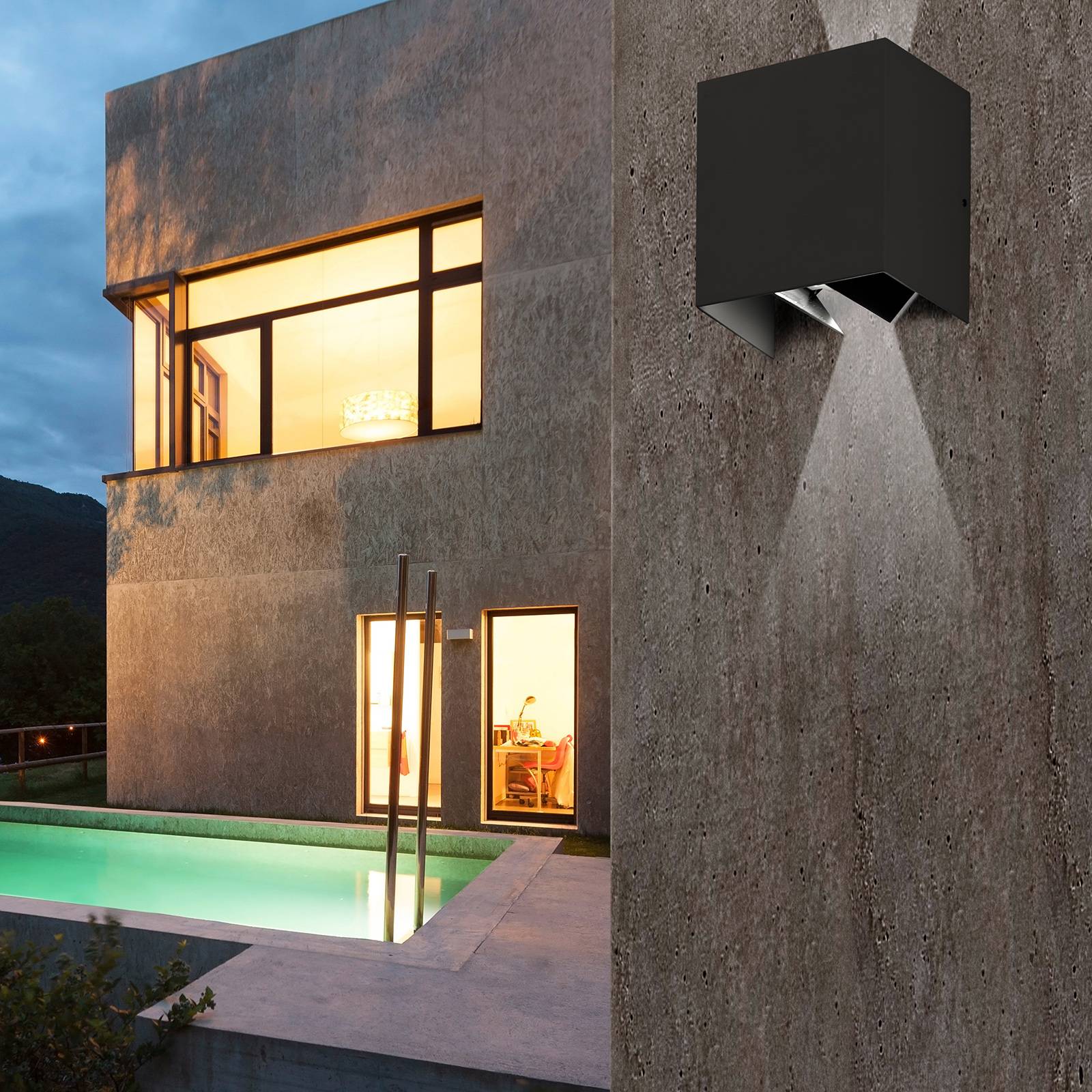 LED-buitenwandarmatuur Olan – voor instelbaar lichtaccent De aluminium rechthoekige afdekking van de Olan LED buitenmuurarmatuur met zijn eenvoudige vormgeving is overdag nauwelijks merkbaar aan de gevel. s Nachts werpen de LED’s, die naar boven en beneden schijnen en zich achter transparante glasafdekkingen bevinden, verticale lichtkegels op de wand. Hun breedte kan naar wens worden beperkt dankzij de scharnierende deksels.