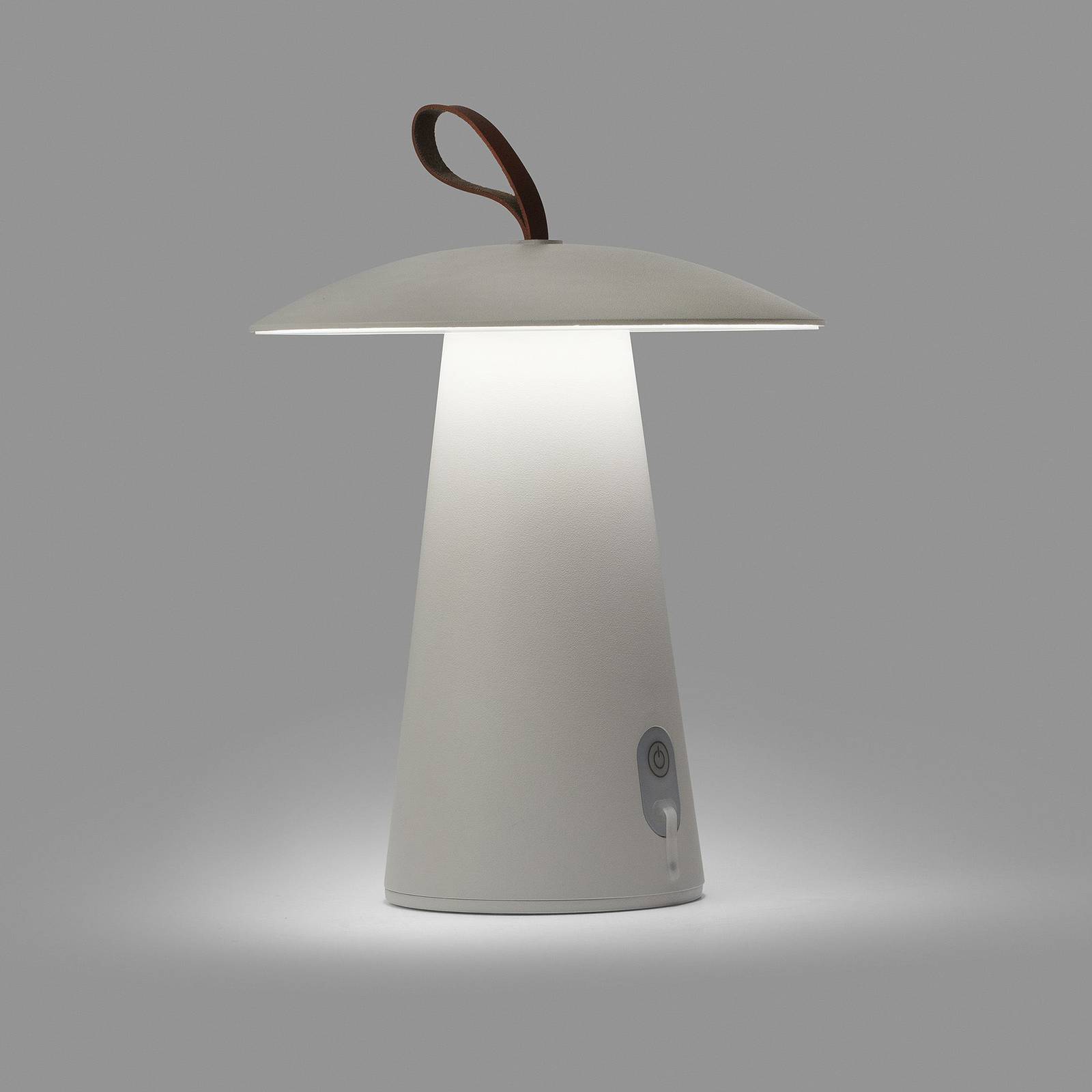 Mobiele LED tafellamp Task voor gebruik buitenshuis met 3 helderheidsniveaus Deze tafellamp voor het terras of balkon, die eruitziet als een paddestoel, kan ook ideaal worden gebruikt voor de buitenruimte van een restaurant. Het straalt zijn warme witte licht indirect uit en creëert zo een sfeervolle ambiance op elke plaats. De verlichtingssterkte kan op drie niveaus worden ingesteld: 100 %, 40 % of 10 %. Task is beschermd tegen sterke weersinvloeden met beschermingsklasse IP54 en wordt opgeladen via de geïntegreerde USB-aansluiting en de meegeleverde USB-kabel. Taak is voorzien van een lederen draagriem voor handig transport. – Lichtduur: 100 % helderheid 6 uur, 40 % lichtsterkte 15 uur en bij 10 % lichtsterkte 80 uur – Oplaadtijd tot volledig opgeladen: ca. 4-5 uur