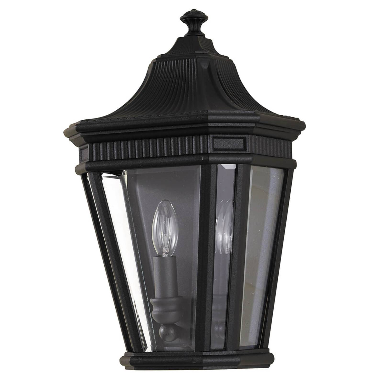 Zwart gelakte buitenwandlamp Cotswold Lane Met haar klassieke ontwerp in de stijl van antieke gaslantaarns is de buitenwandlamp Cotswold Lane van gegoten aluminium en helder glas een sieraad voor elke huisgevel en zorgt ze tegelijkertijd voor een adequate buitenverlichting, bijvoorbeeld bij de ingang, wat ook de veiligheid rond het huis verhoogt. De twee kaarsen zijn te zien door het heldere glas: Hun licht straalt ongehinderd naar links en rechts en naar voren, wat een zeer sfeervol effect heeft.