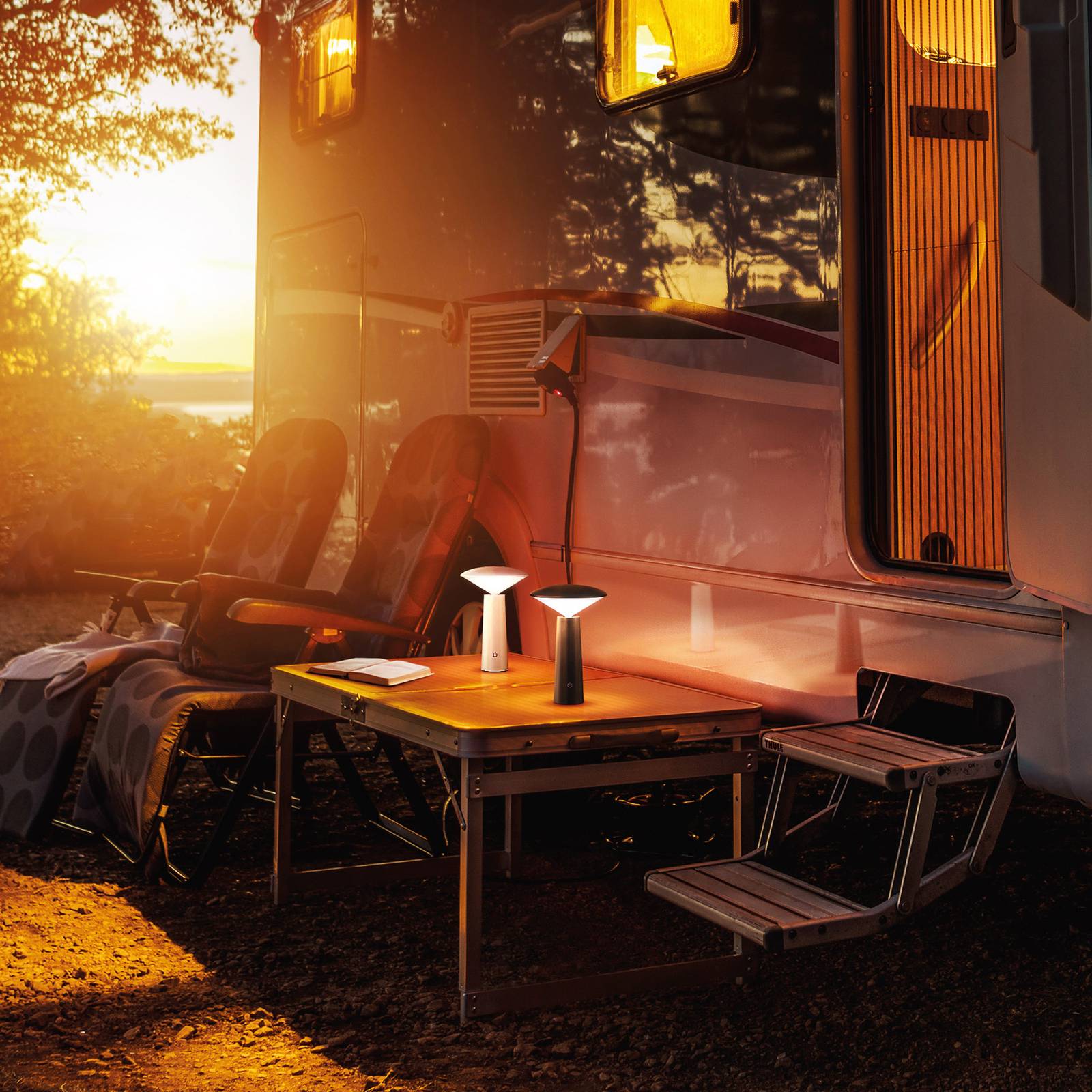 LED tafellamp Pinto met instelbare kleurtemperatuur De tafellamp Pinto is gemaakt van kunststof en is dankzij haar IP44-beschermingsgraad ook geschikt voor gebruik buitenshuis. De armatuur heeft een USB-aansluiting en kan worden opgeladen met een bijbehorende kabel. Pinto is dus niet plaatsgebonden en kan bijvoorbeeld worden gebruikt als verlichtingselement tijdens een uitstapje in de buitenlucht, maar ook op het balkon of terras. Dankzij de flexibel verstelbare lampkop, de dimfunctie en de mogelijkheid om de lichtkleur (3000 K – 4750 K – 6500 K) te veranderen, kunnen de lichtverhoudingen op elk moment aan de individuele behoeften worden aangepast.