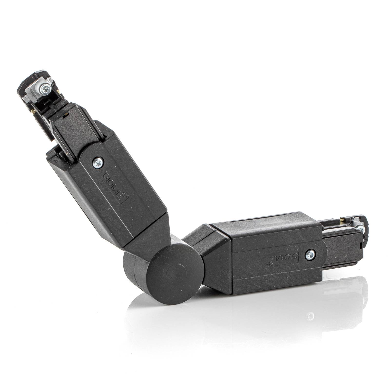 Hoekverbinding voor 3-fase stroomrail Noa De flexibele hoekverbinding voor de 3-circuitbaan Noa kan worden gebruikt met een hoek van 60° – 300°. Het verbindt betrouwbaar twee 3-circuit tracks over de bochten.