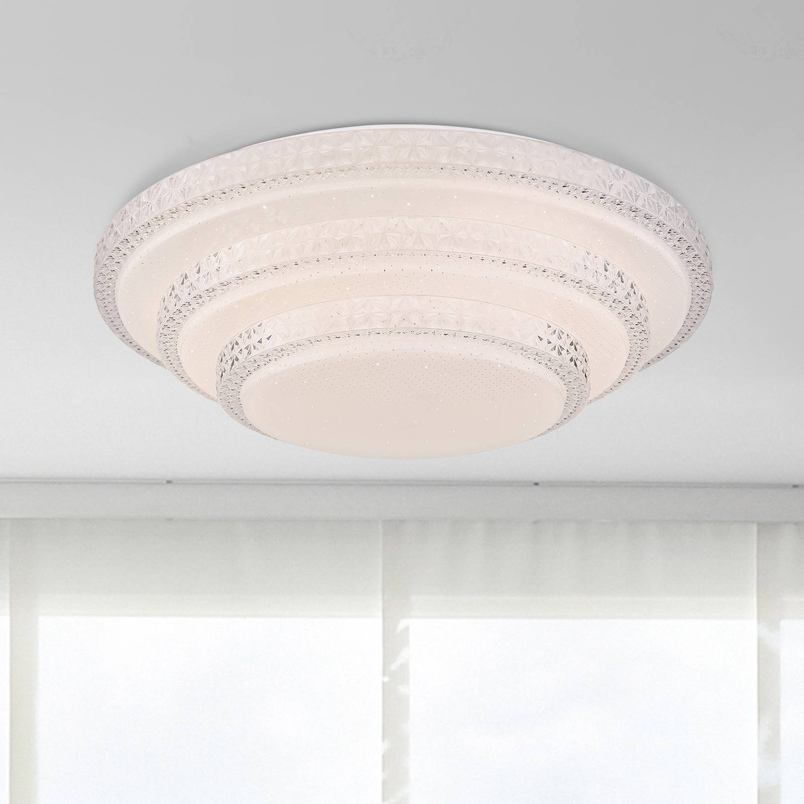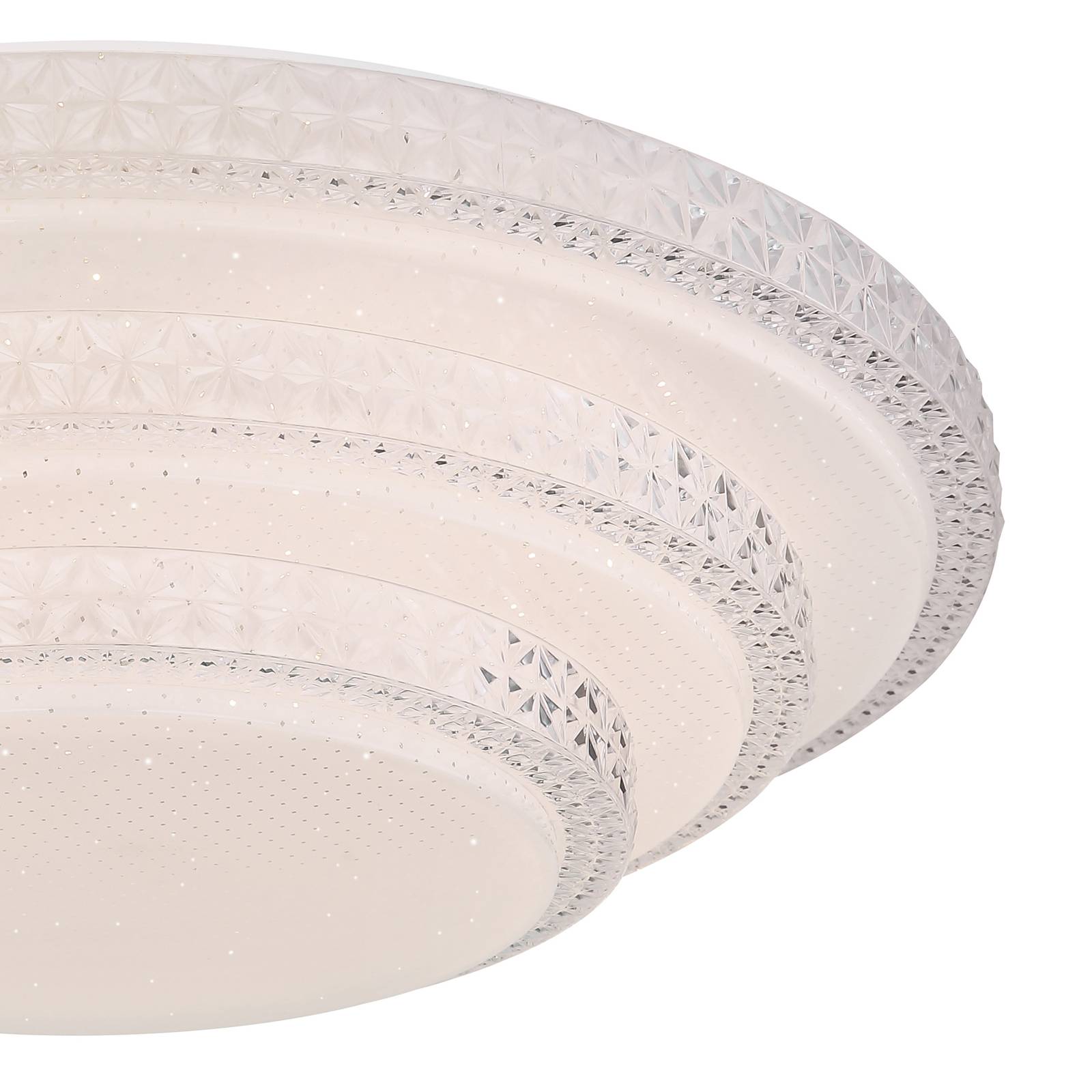 Slimme LED-plafondlamp Magnifique met CCT-functie Magnifique is een moderne en praktische Smart Home LED plafondlamp die kan worden bediend met behulp van een afstandsbediening of met de Tuya app. De armatuur is gemaakt van ijzer en kunststof en presenteert zich in een effen wit. Aan de randen van de lampenkap is hij voorzien van een opvallend glitterdecor, dat hem net dat ietsje meer geeft. De permanent geïnstalleerde LED’s kunnen worden gedimd en qua lichtkleur worden geregeld en zorgen zo altijd voor een passende verlichting. Zelfs als ze uit is, is de Magnifique LED plafondlamp een mooi decoratief stuk en plaatst ze opvallende accenten op plafonds. Technische gegevens – Lichtkleur instelbaar van warm wit tot daglicht – dimbaar – Geheugenfunctie – Nachtlicht functie Speciale kenmerken/compatibiliteit – Bedienbaar via de gratis Tuya Smart app (beschikbaar voor iOS en Android) – compatibel met spraakassistenten Amazon Echo en Google Home (extra componenten vereist) – als alternatief te bedienen via de bijgeleverde afstandsbediening