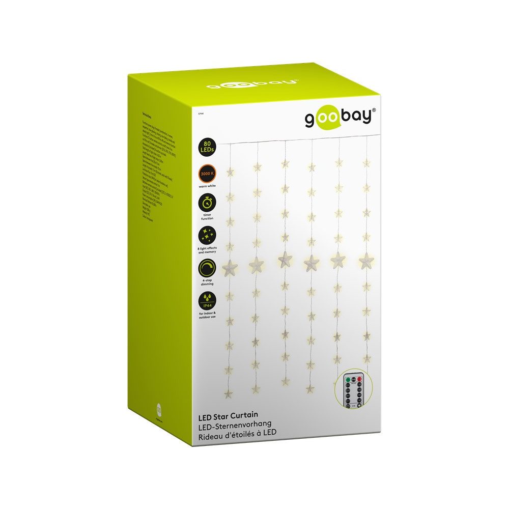 De verlichting is voorzien van een IP44 spatwaterdichtheid. Deze IP-waarde zorgt ervoor dat de sfeerverlichting zeer ultiem tegen vocht en stof kan. Ook is de verlichting hierdoor bestemd tegen ijzel, sneeuw en regen. Natuurlijk kun je dit huiselijke gordijn ook in huis hangen als je dat liever wil.