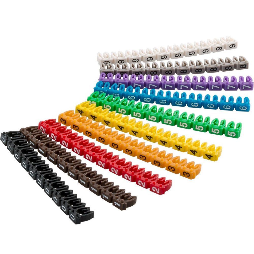 Verpakking van 100 stuks markeerclips voor kabels na montage om beter de kabels van elkaar te kunnen onderscheiden bij de installatie. De kleuren in de verpakkingsmateriaal zijn;wit, grijs, lila, blauw, groen, geel, oranje, rood, bruin en zwarte clips.