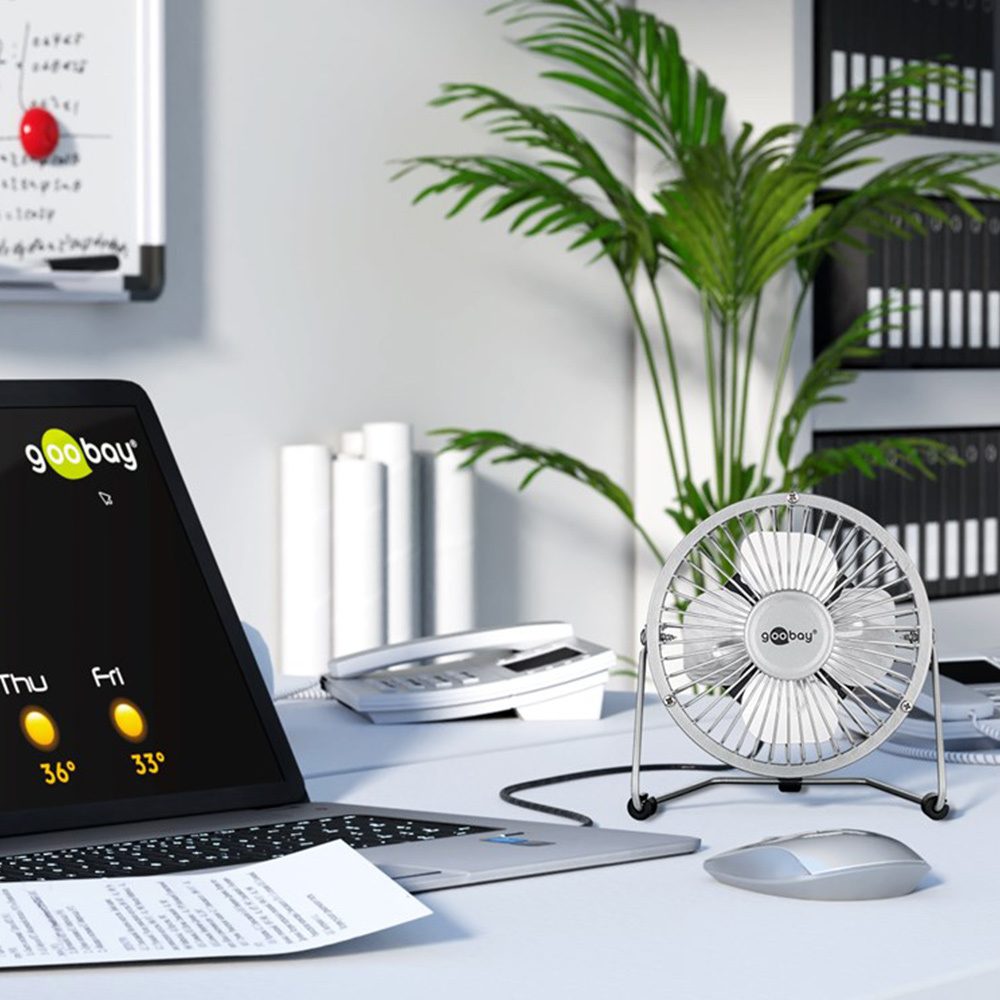 Ben je op zoek naar verkoeling in huis handbereik? Dan zit je met deze USB ventilator extreem. Deze aluminium ventilator kan aangesloten worden op elk apparaat met een USB poort, bijvoorbeeld laptops en computers. Door de kabellengte van meer dan 1 meter en de lock functie kun je deze compacte bureauventilator goed op je bureau plekken.