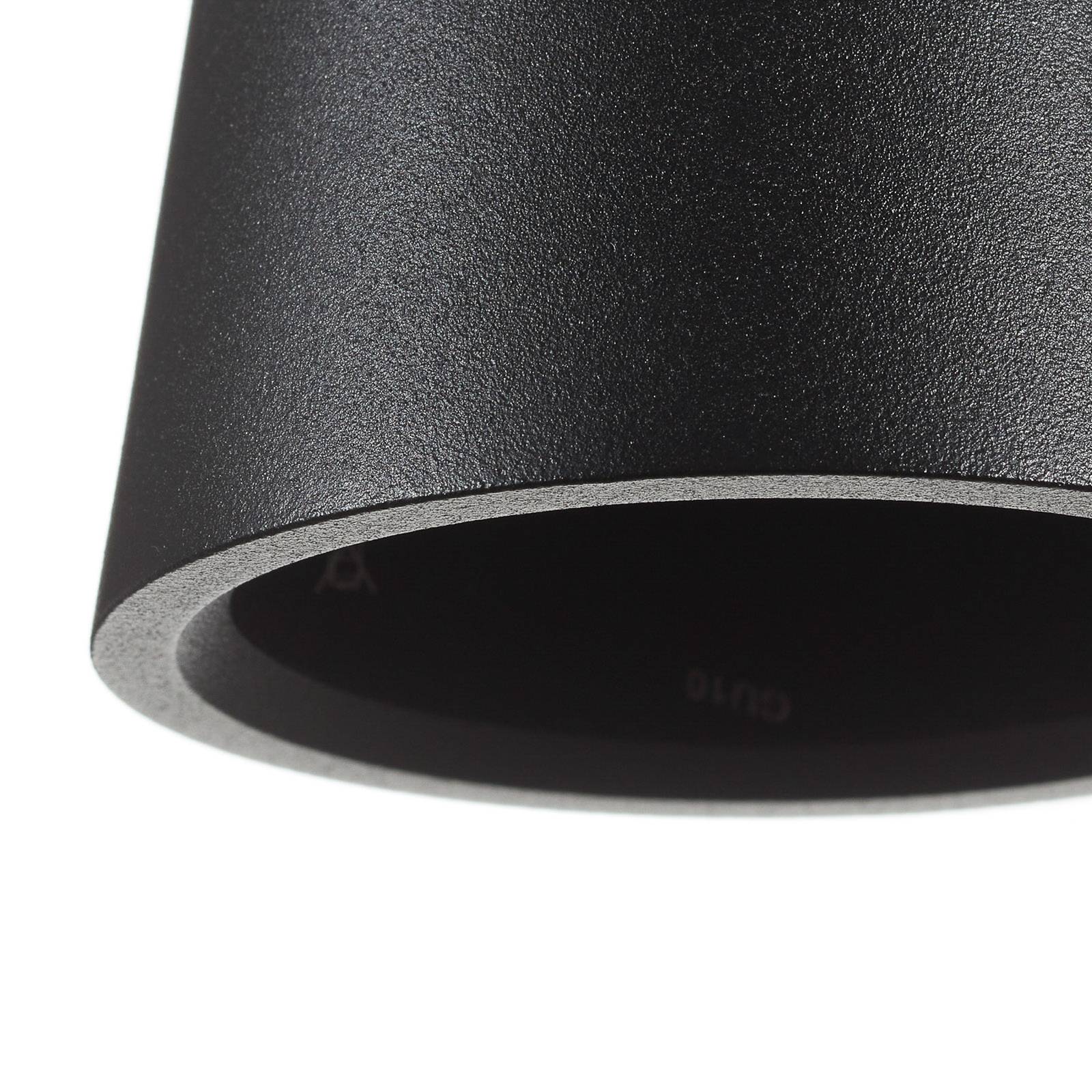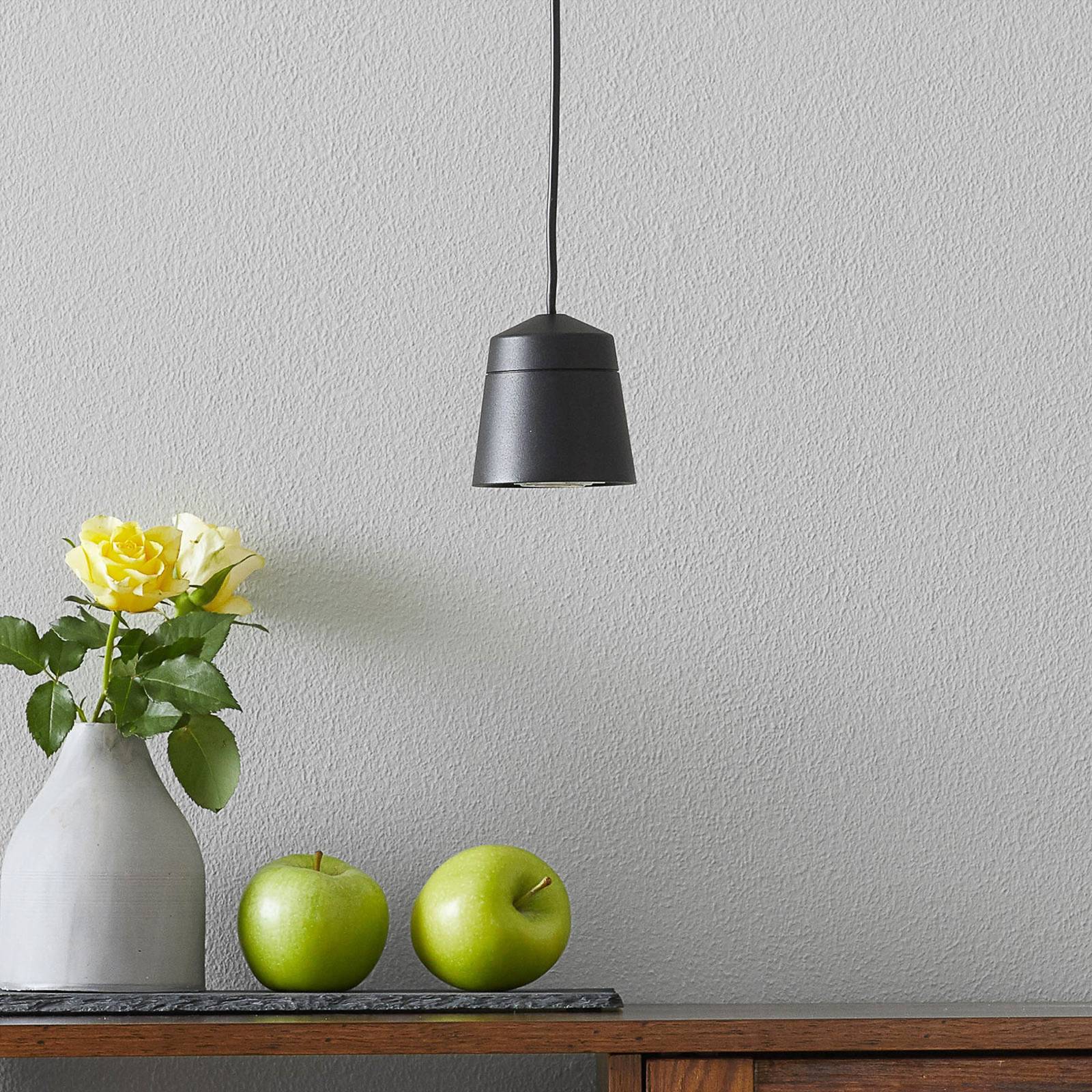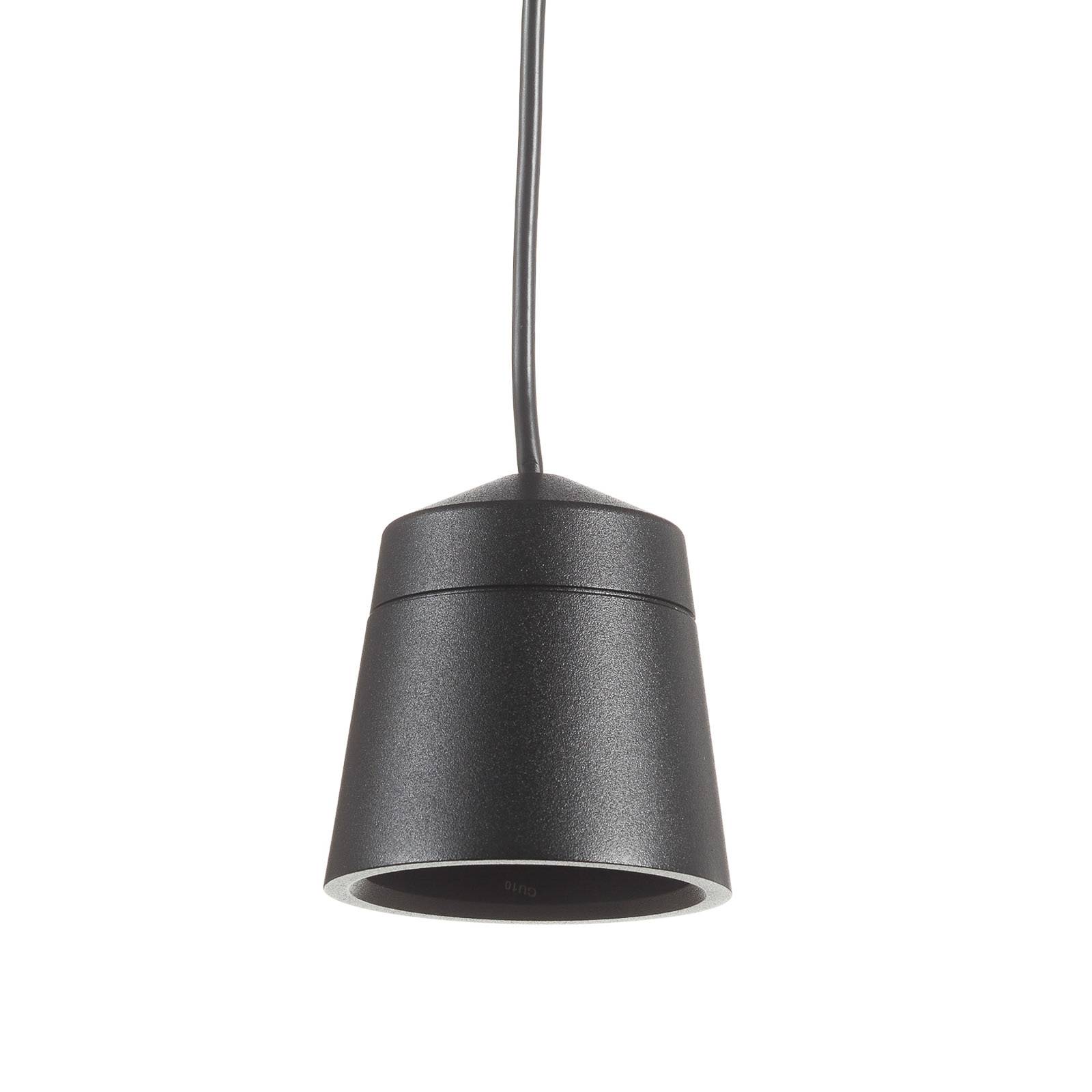 Zwarte pendelarmatuur Leo voor directe verlichting met een 3-circuit railsysteem De Leo pendelarmatuur kan worden uitgerust met een GU10 LED-lamp (QPAR16) naar keuzemogelijkheid voor een gerichte punt-, vlak- of algemene verlichting naar keuzemogelijkheid. De zwarte lampenkap van aluminium is vormgegeven als een afgeknotte kegel die aan de onderkant open is. Het wordt vastgehouden door een zwarte kabel. Leo is uitgerust met een adapter voor montage in een 3-fase rail.