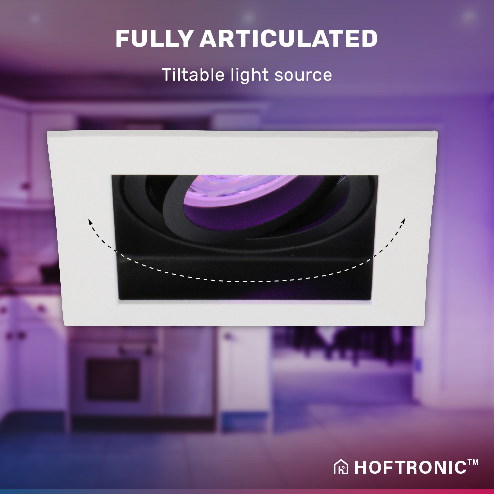 Deze 6 smart Durham LED inbouwspotjes zijn een eyecatcher voor iedereen die sfeer in woonruimte wil halen. Met de eindeloze mogelijkheden van deze via de Hoftronic Smart app bestuurbare smart inbouwspots haal je hedendaagse, duurzame en energiezuinige spotjes in huis. Je kunt maar liefst 16.5 miljoen allerlei kleuren instellen en met de vervangbare GU10 lichtbronnen zorgt deze totale set van unieke smart inbouwspots voor jarenlang plezier.