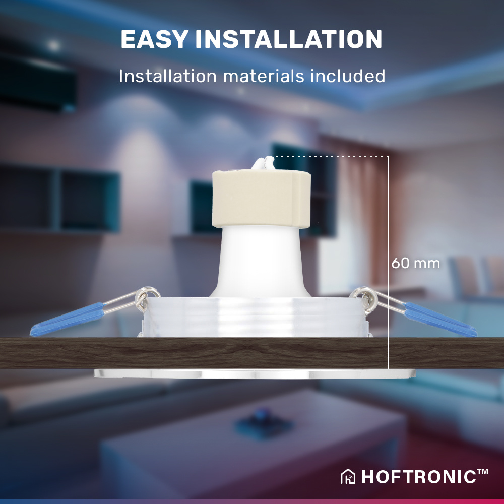 Deze inbouwspot word installeerklaar geleverd: het pakket bestaat uit 3x een kantelbare armatuur inbegrepen de klemveren, een smart 5W GU10 LED spot, een GU10 fitting en 2 kroonsteenaansluitingen (wago klemmen).