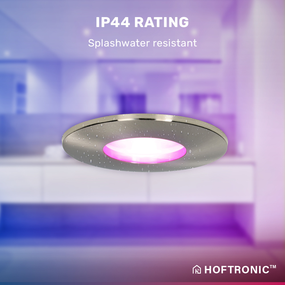 Dankzij de IP44 beschermingsklasse zijn de Vegas Smart Home inbouwspots ook bekwaam voor natte ruimtes. Denk aan badkamerverlichting of zelfs terrasverlichting, die je helemaal slim kunt maken met deze moderne inbouwspots! Let op: De IP44 spots kunnen niet over een gesloten douchecabine gehangen worden. Hiervoor zijn IP65 inbouwspots nodig.