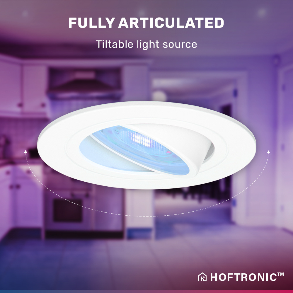 Deze set van 6 slimme inbouwspots bezit over zowel WiFi als Bluetooth waardoor het koppelen met het WiFi netwerk alsmaar lukt. De inbouwspots zijn dimbaar in 16,5 miljoen kleuren, waardoor er altijd een lichtkleur is die hoort bij bij jouw sfeer. Door de ronde plafondspots te verbinden met je de Hoftronic Smart app krijg je mede oprijlaan tot tientallen smart functies.