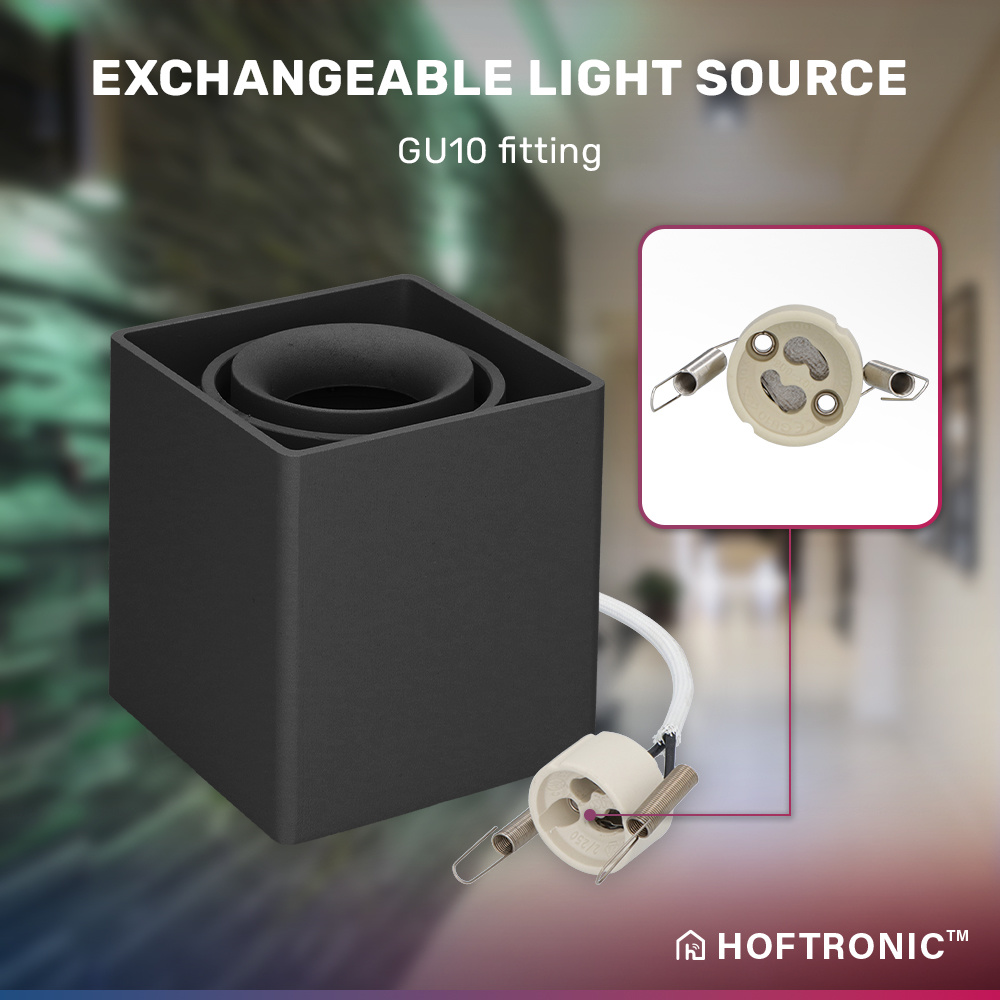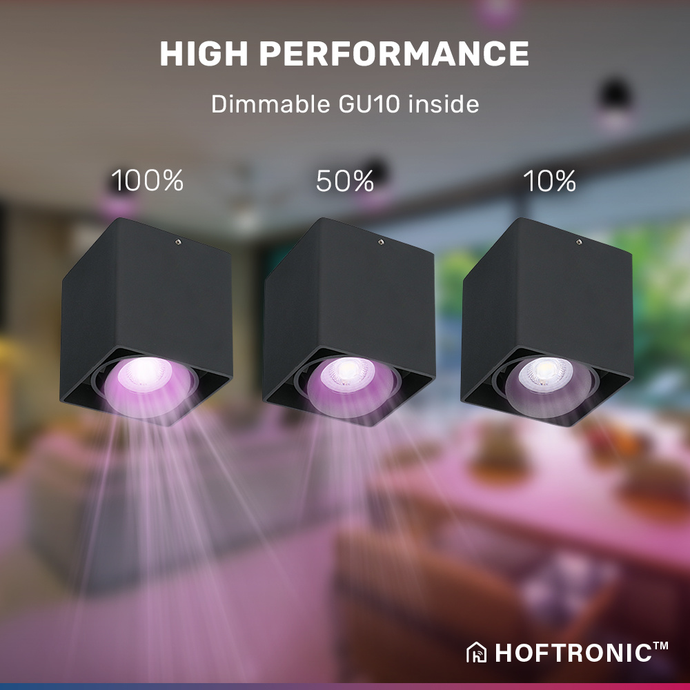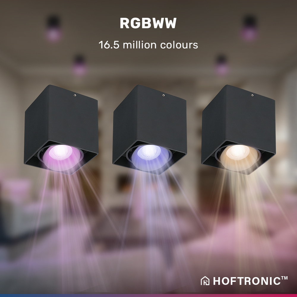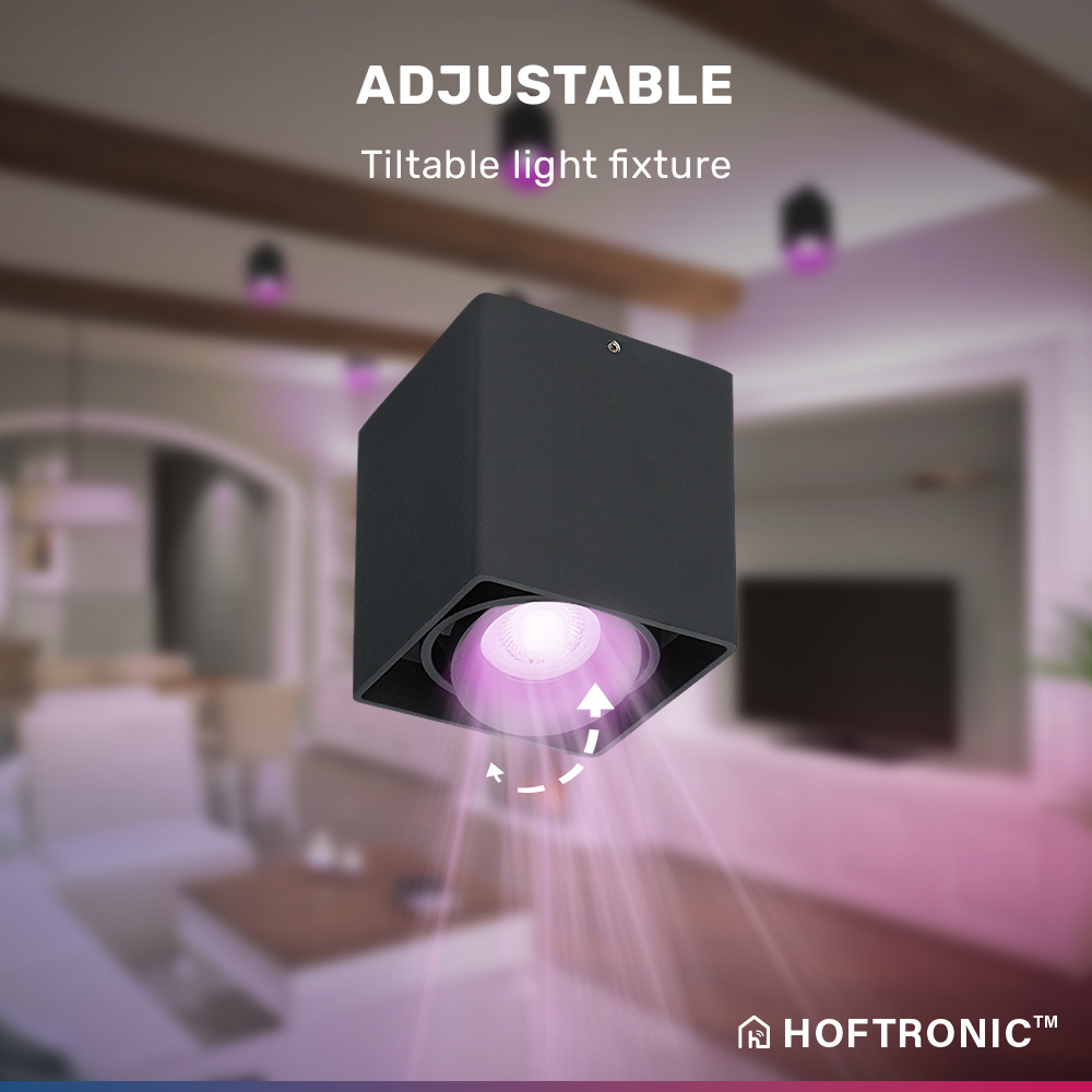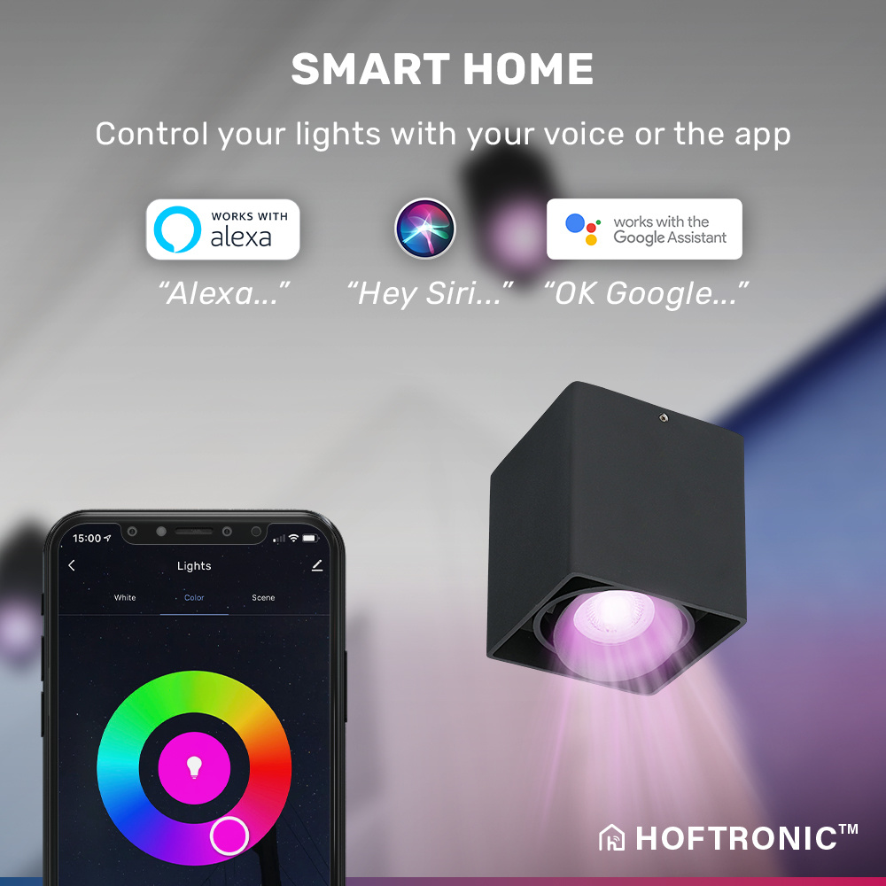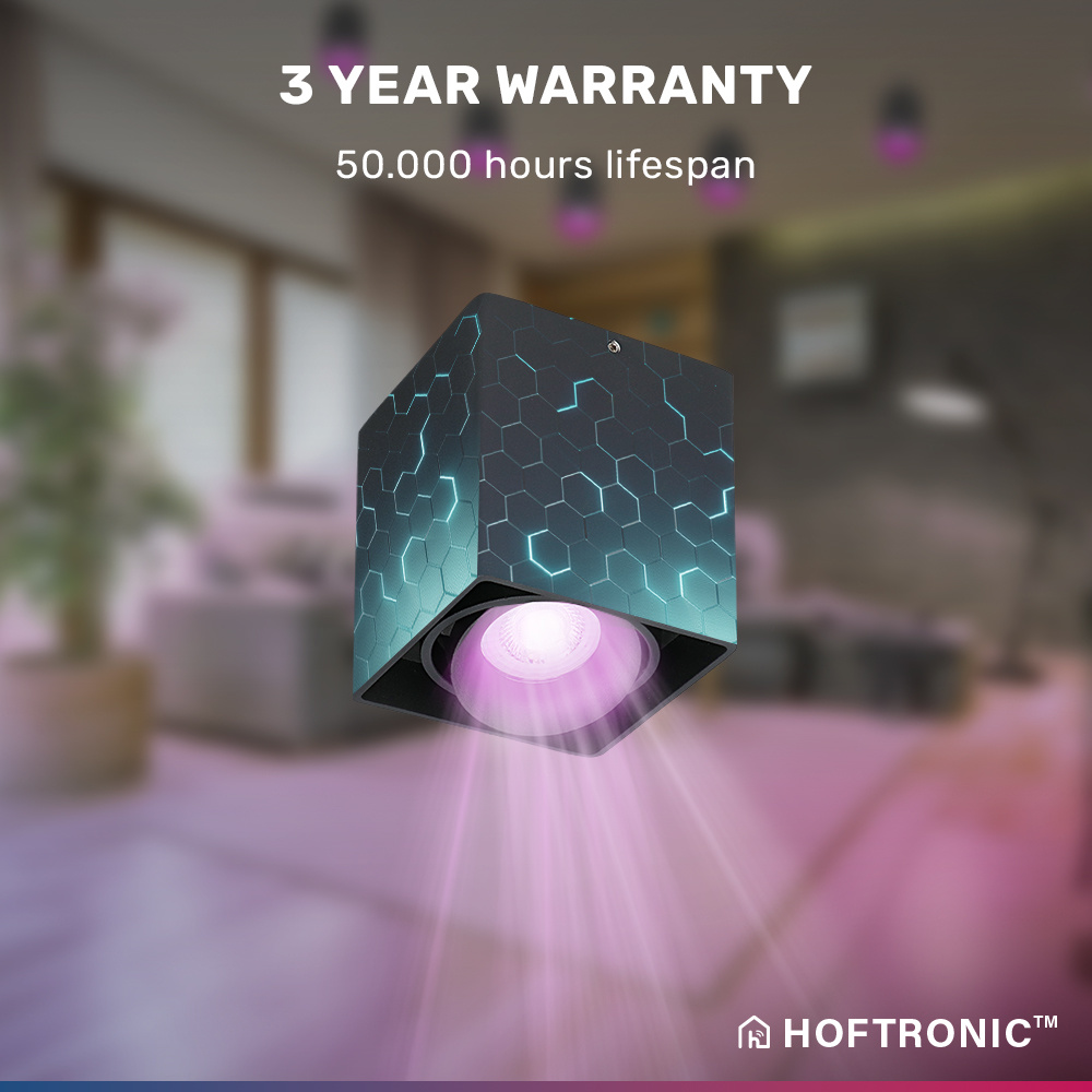 Er wordt standaard een smart GU10 spot van Hoftronic meegeleverd. Deze is heel moeiteloos te afwisselen en dat heeft twee voordelen. Ten eerste kun je na aankoop aanhoudend nog switchen van lichttemperatuur. Zo maak je van een nuttige opbouwspot gemakkelijk sfeerverlichting en andersom. Ten tweede wordt de levensduur van de lamp verlengd, omdat je geen kersverse opbouwspot hoeft aan te schaffen zodra de lichtbron het begeven heeft.