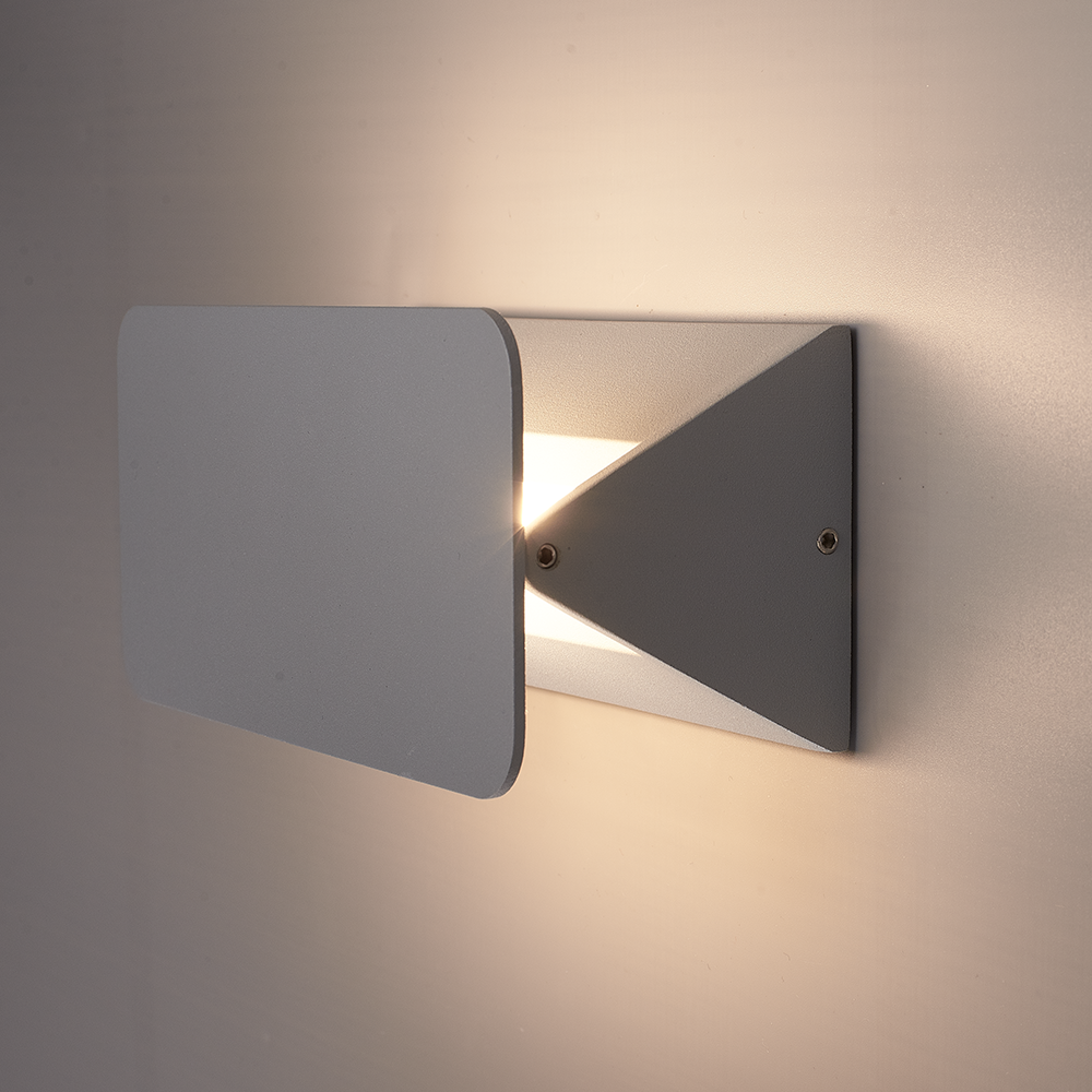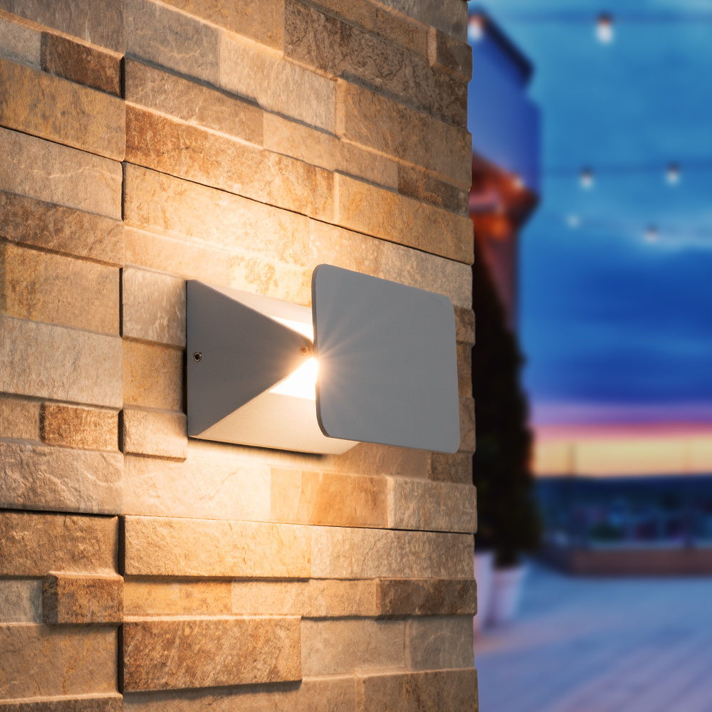 De grijze LED wandlamp Toledo met kantelbaar voorpaneel en IP54 waterbestendigheid voor in huis en buiten