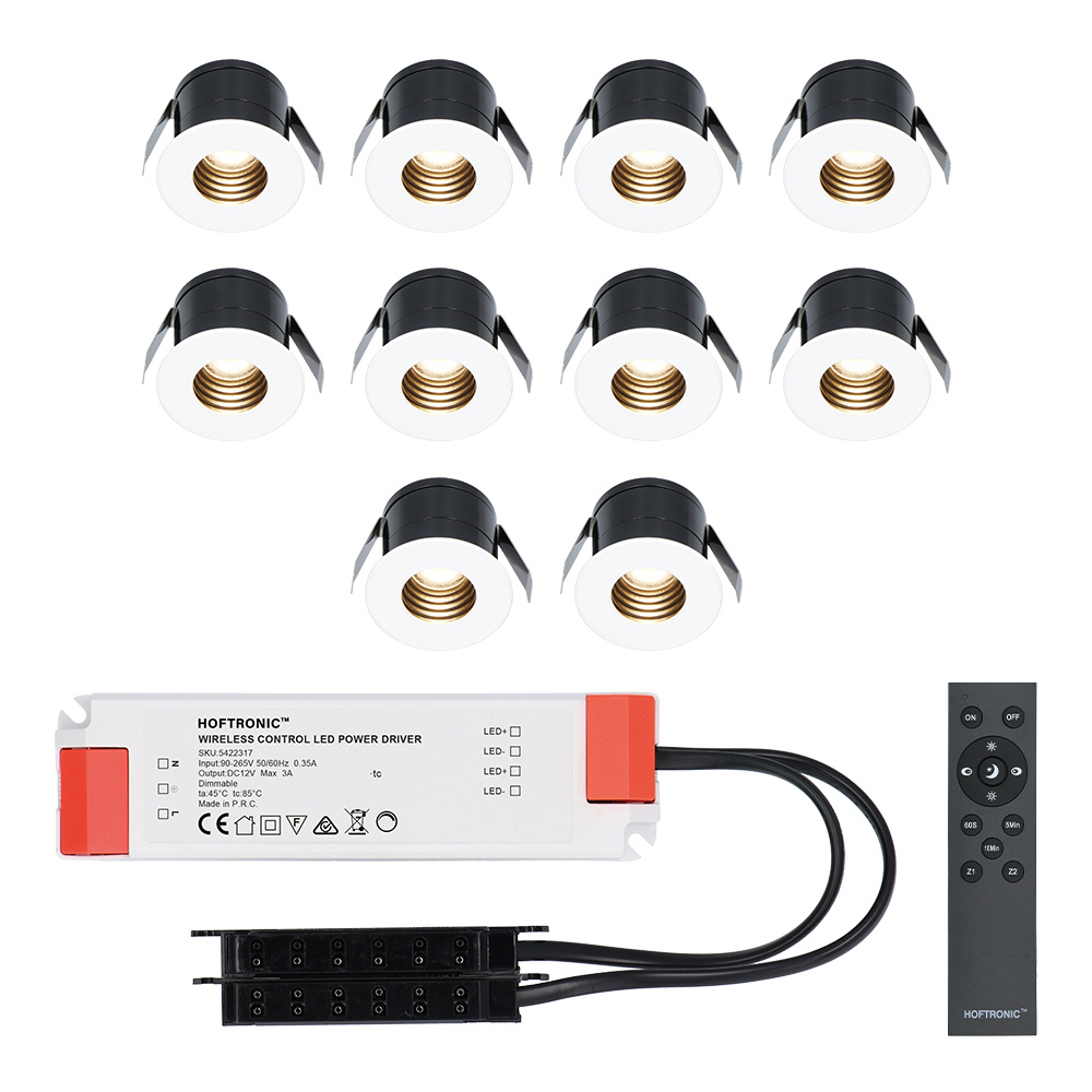 De Hoftronic Betty dimbare inbouwspot zijn traploos dimbaar, wat betekent dat je in een vloeiende overgang van 100% naar 0% kunt dimmen, en gedraaid. De kleurtemperatuur is 2700K, wat staat voor warm wit licht. Er wordt een afstandsbediening bij geleverd. Zit je lekker in je luie stoel op de uitbouw, of lig je languit in bad en denk je: de verlichting staat toch iets te fel? Met de afstandsbediening dim je de verlichting onmiddelijk, en hoef je dus niet op te staan. Ideaal.